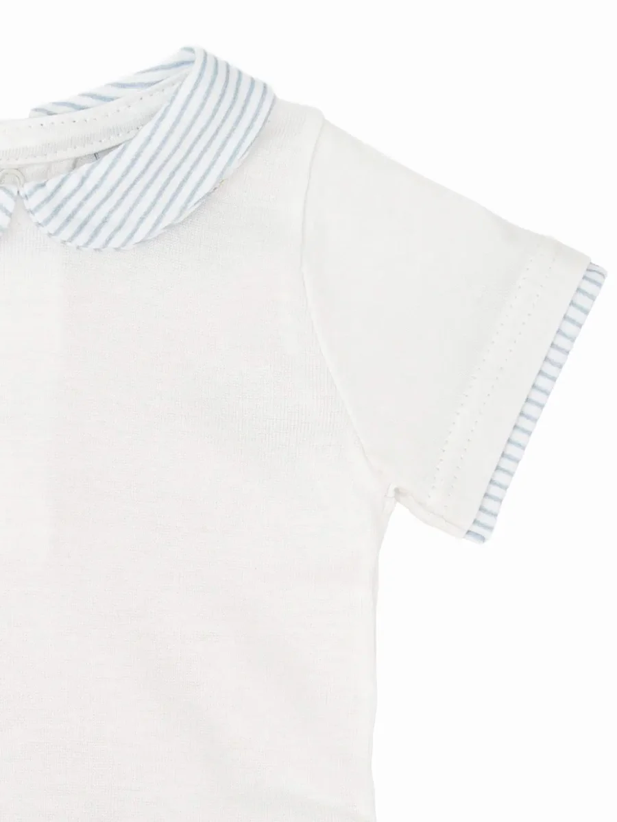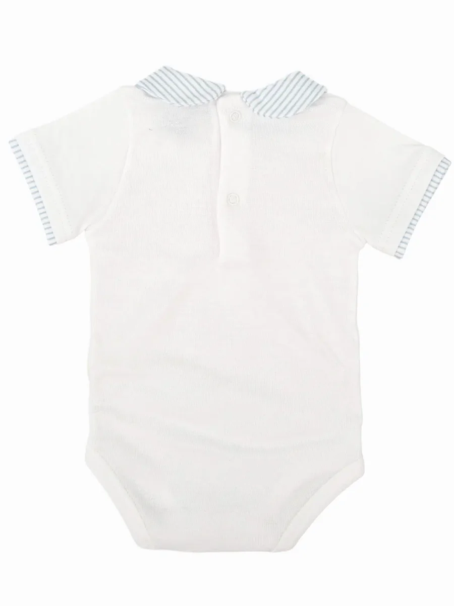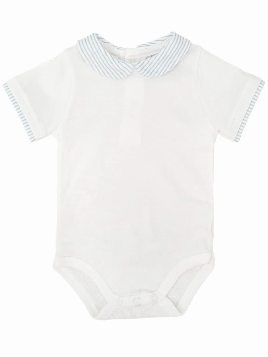 Le body manches courtes est confectionné en 100 % coton, une matière douce et agréable au contact de la peau délicate de bébé. Son atout principal : son joli col rayé, qui structure la tenue avec subtilité.