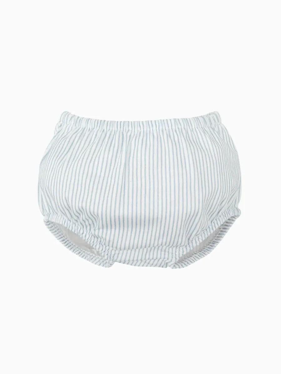 Le bloomer rayé bleu ciel et blanc complète parfaitement le body. Sa taille élastiquée permet un ajustement confortable, tout en facilitant l’habillage. Il épouse les mouvements de bébé sans le gêner.