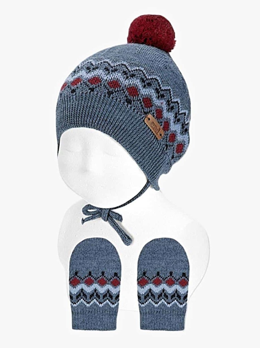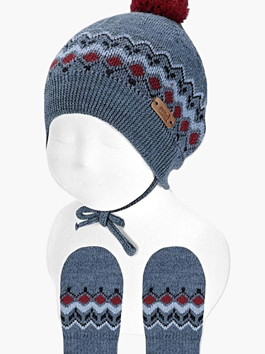 Ensemble bonnet à pompon et moufles assorties Motifs hivernaux Contient de la laine mérinos Fabriqué en Espagne