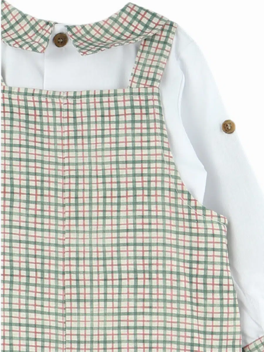 La chemise blanche de l’ensemble est soigneusement pensée : elle présente un col rond et des poignets habillés du tissu à carreaux vert et rouge, rappelant le motif de la salopette pour un effet coordonné raffiné. Ses manches retroussables permettent d’adapter la tenue aux changements de température ou aux envies de style, tout en gardant bébé libre de ses mouvements. Les boutons en bois sur le devant ajoutent une note naturelle et élégante à l’ensemble.