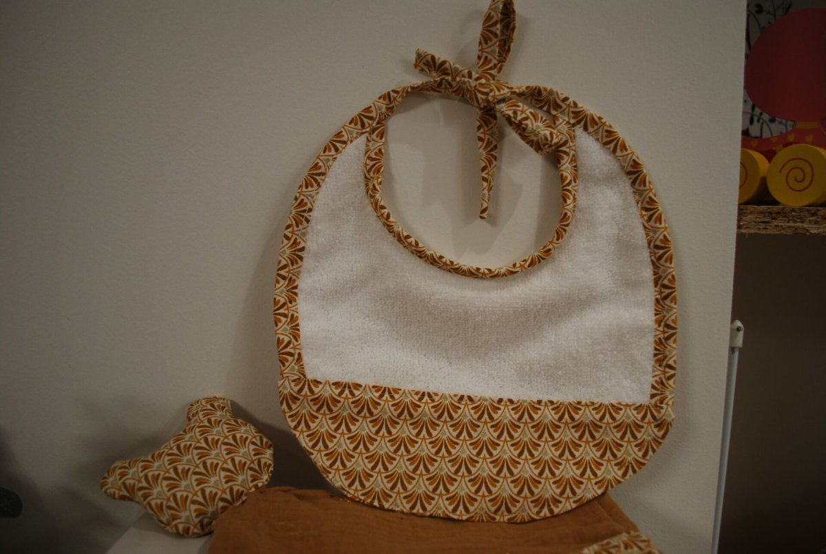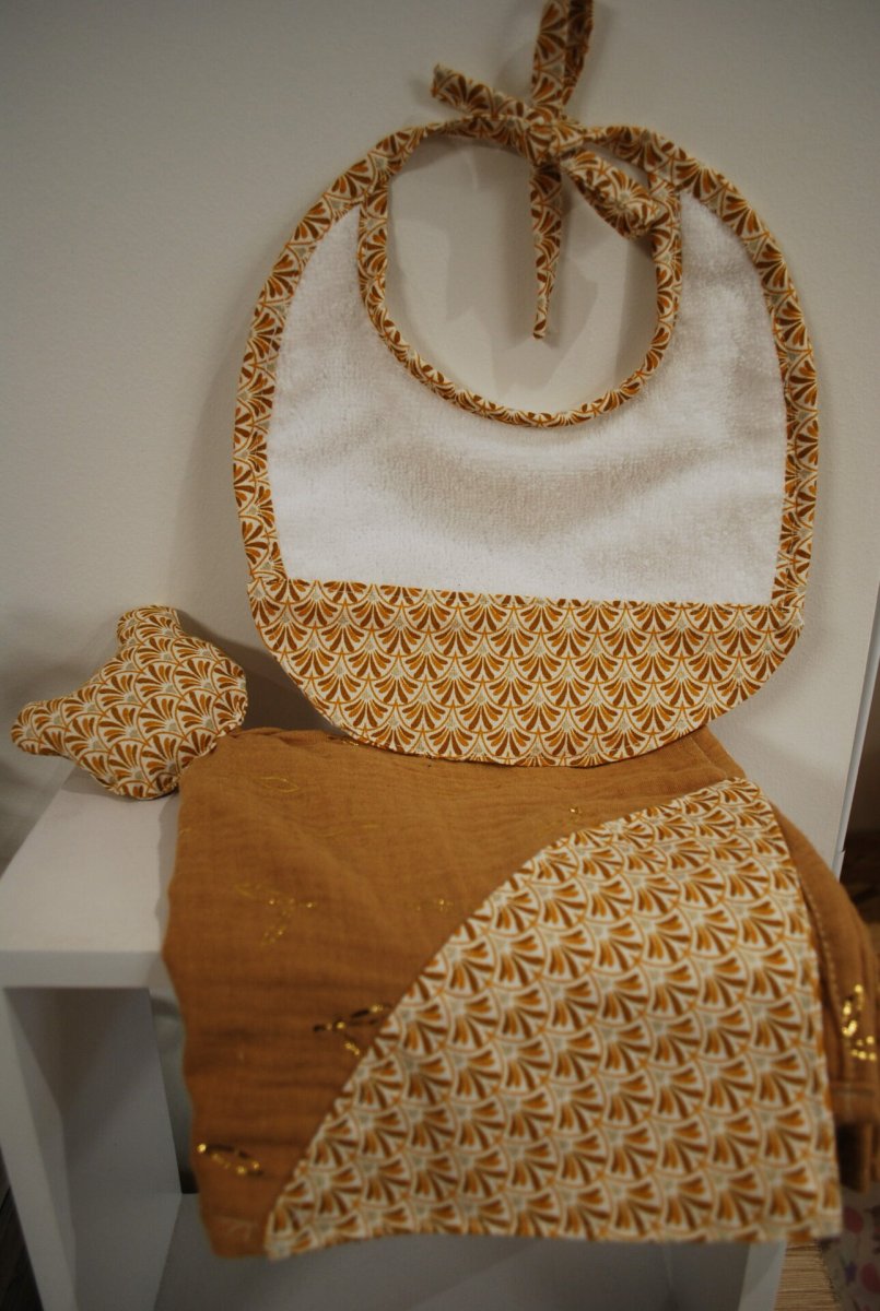 Joli ensemble pour bébé “GOLD” : Petit coffret à offrir , ce doudou avec un bavoir assorti dans les tons de camel et doré. Le doudou a tête en coton et un intérieur ouaté avec le reste du corps en gaze.