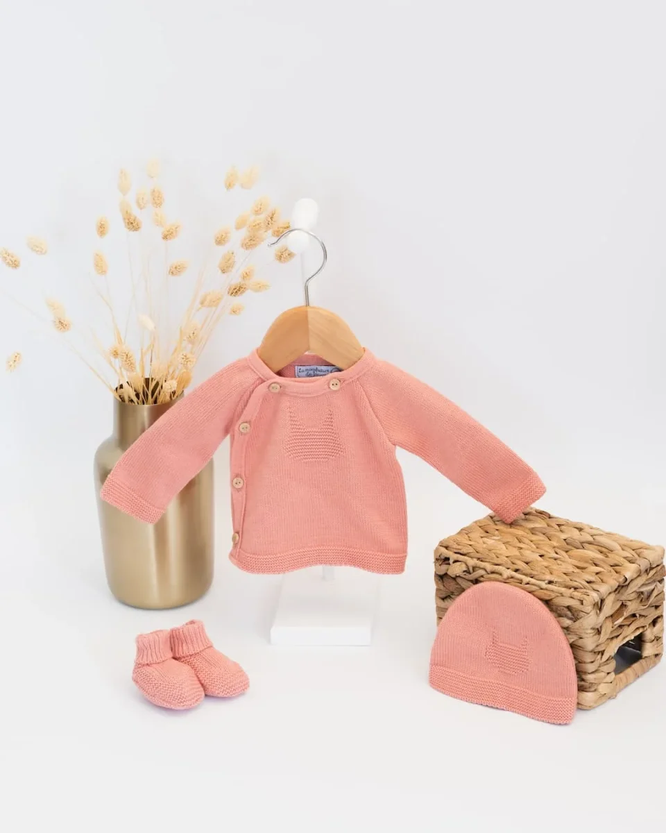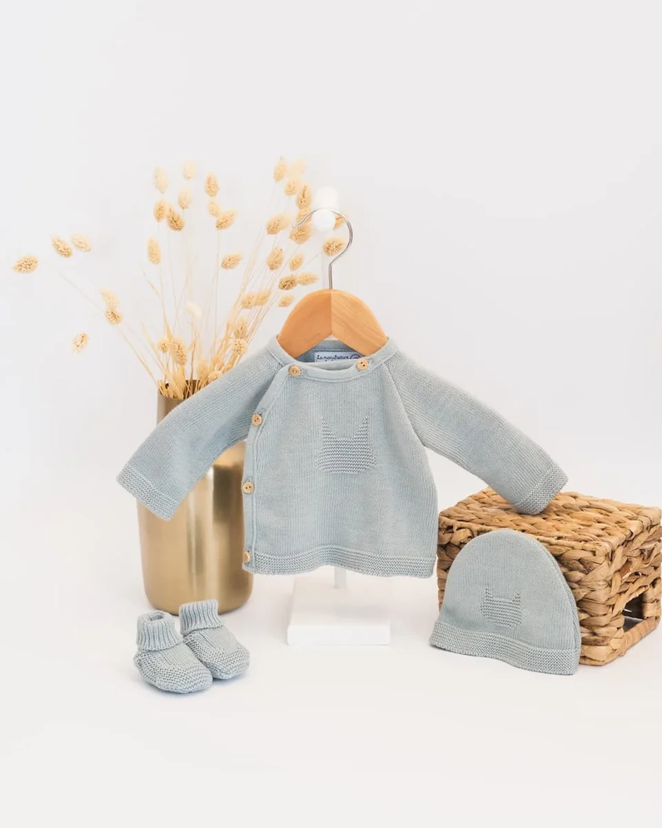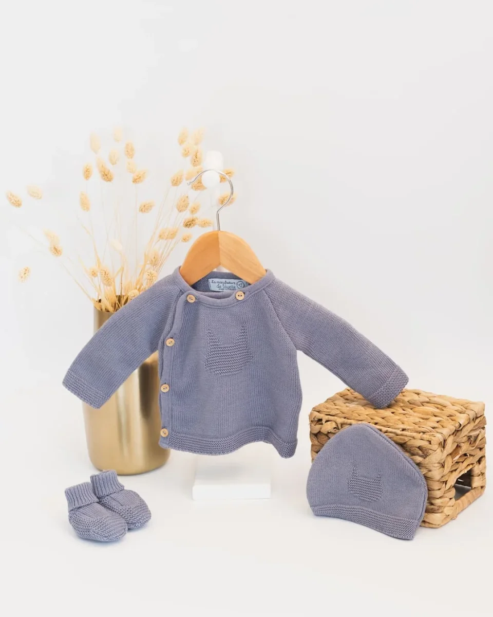 Un adorable petit ensemble de naissance pour bébé. Cet ensemble en coton pour bébé est tricoté et fabriqué en France dans notre atelier. Cet ensemble de naissance comprend une brassière en tricot pour bébé avec son bonnet et ses chaussons en tricot assortis. Grâce à sa composition 100% coton, cet ensemble apportera beaucoup de douceur […]