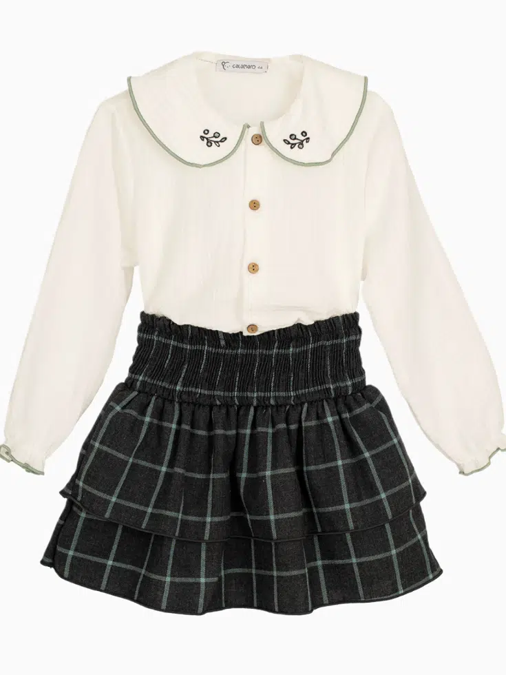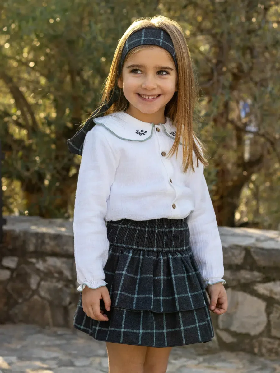 Découvrez notre ensemble fille composé d’une jupe à volants à carreaux gris/vert et d’une chemise en gaze de coton blanche, conçu pour habiller votre enfant avec élégance au quotidien comme pour les moments spéciaux. Cet ensemble allie confort, raffinement et praticité, tout en respectant l’univers intemporel que nous défendons, afin d’offrir à votre enfant une tenue qui lui permette de bouger librement tout en étant joliment vêtue.