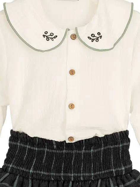 La chemise en gaze de coton blanche, douce et respirante, est sublimée par un col rond brodé de motifs feuilles qui apportent une touche poétique et élégante. Son liseré vert au col et aux poignets fait un rappel discret avec les carreaux de la jupe pour un ensemble parfaitement coordonné. Les boutons en bois sur le devant ajoutent une finition naturelle, dans un esprit authentique et chaleureux, tout en facilitant l’habillage.