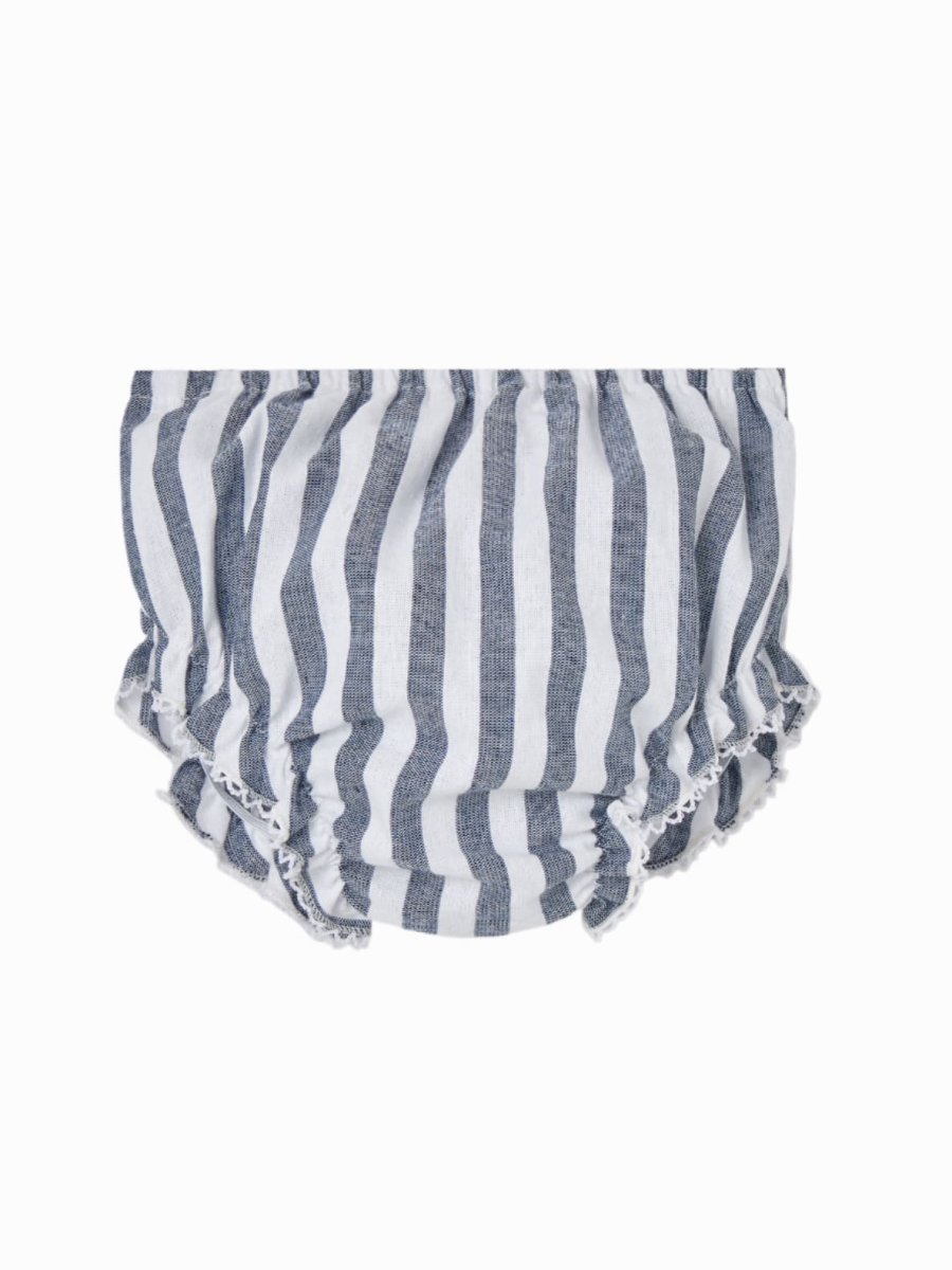Le bloomer assorti, rayé bleu marine et blanc, complète parfaitement la tenue. Confortable et facile à enfiler, il permet de préserver l’harmonie de l’ensemble tout en offrant une aisance optimale à l’enfant.