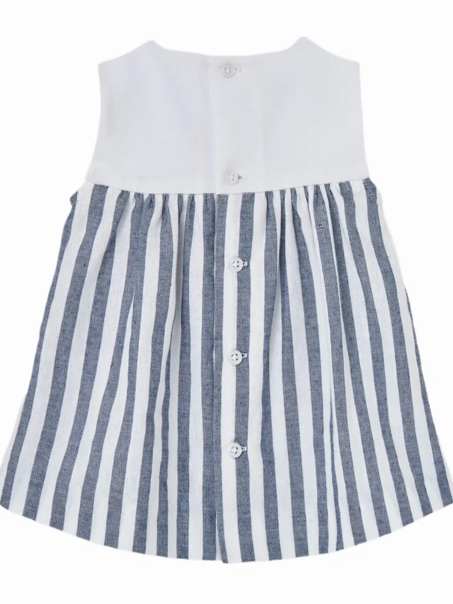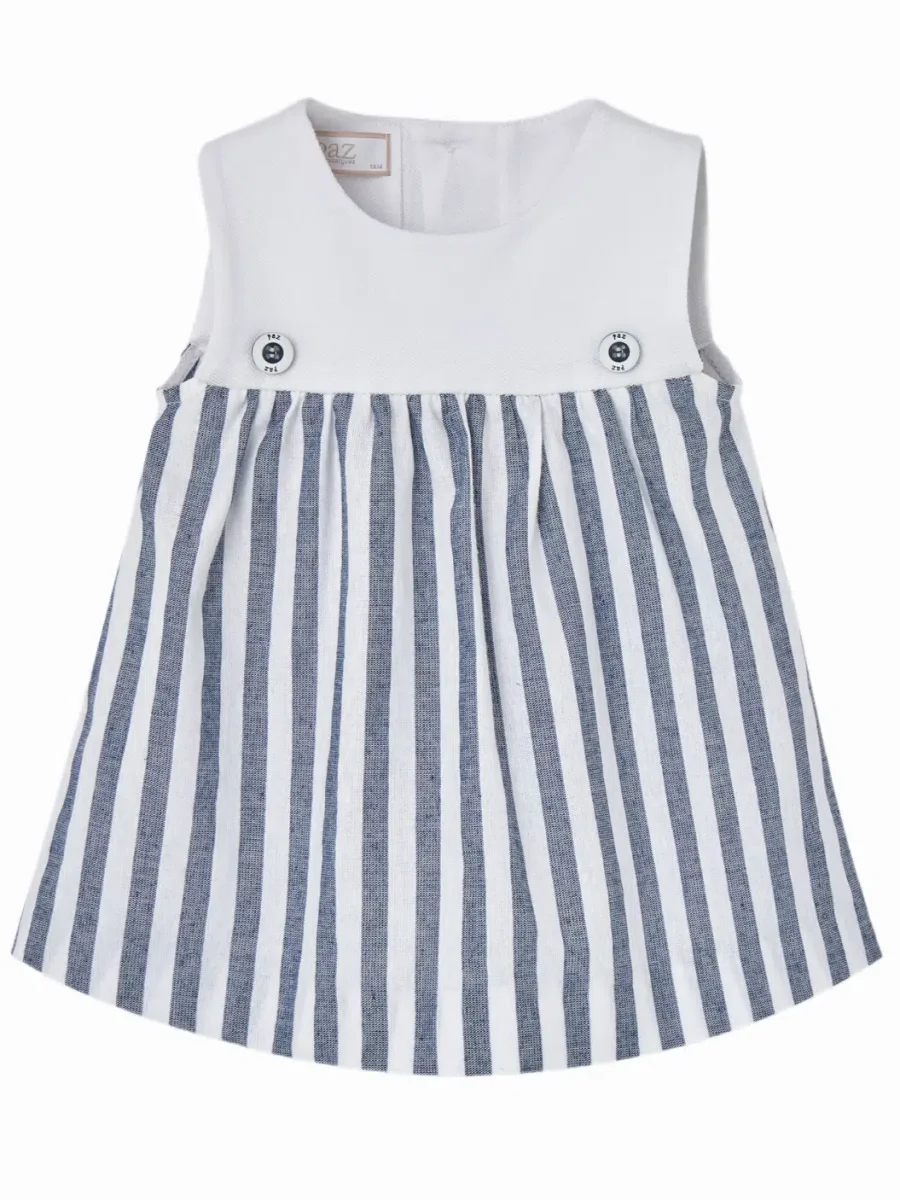 La robe courte sans manches se distingue par son design épuré et ses finitions délicates. Le haut de la robe est blanc, apportant luminosité et douceur, tandis que les rayures bleu marine et blanches commencent légèrement plus bas, structurant la silhouette avec subtilité.