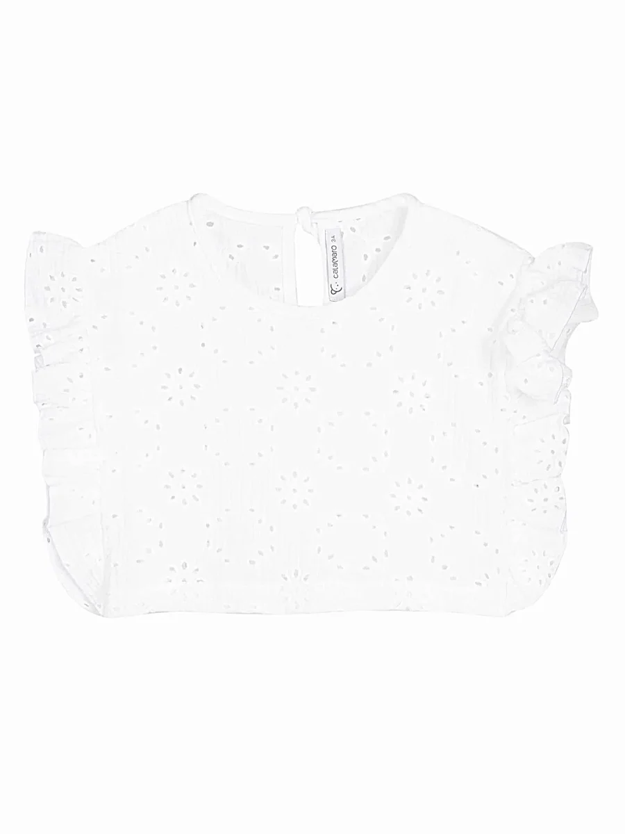 La blouse à manches courtes est ornée de volants et de détails ajourés, apportant un style féminin et élégant à la tenue. Sa coupe légère et aérée assure un confort optimal même lors des journées chaudes. L’encolure ronde et les finitions soignées soulignent la qualité et l’attention portée aux détails, pour un vêtement à la fois pratique et raffiné.