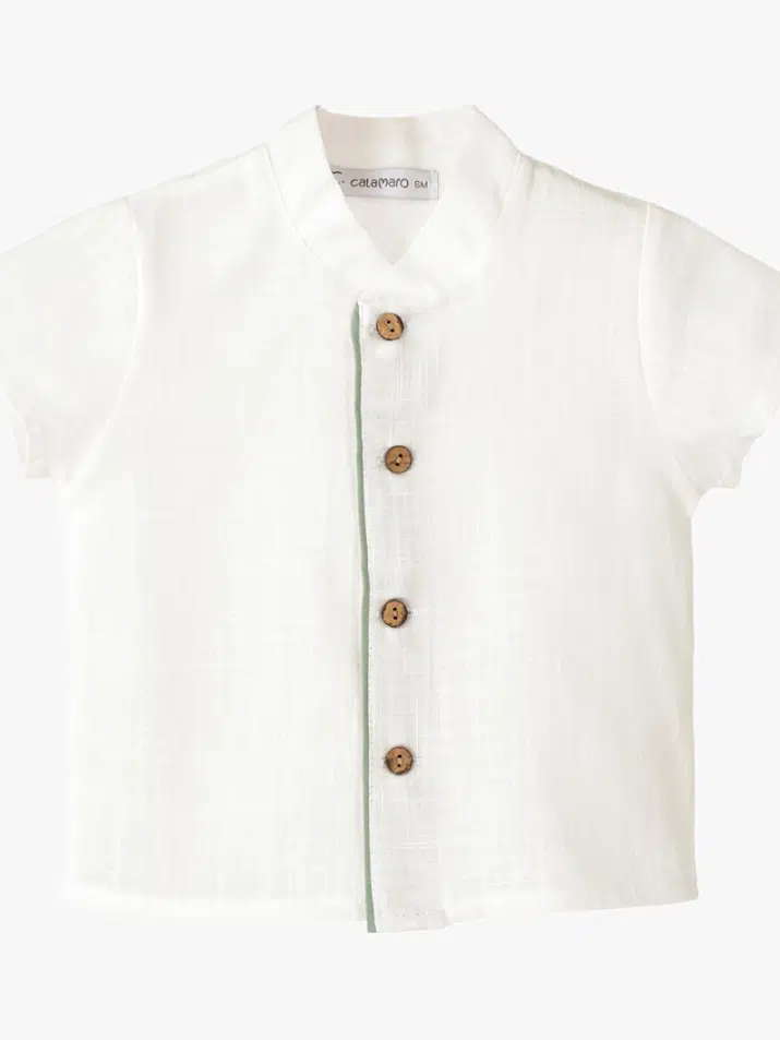 La chemise blanche à manches courtes, confectionnée en 100 % coton, allie légèreté et douceur. Elle se distingue par un liseré vert délicat le long de la patte de boutonnage, ajoutant une touche d’harmonie et de contraste subtile avec le short.