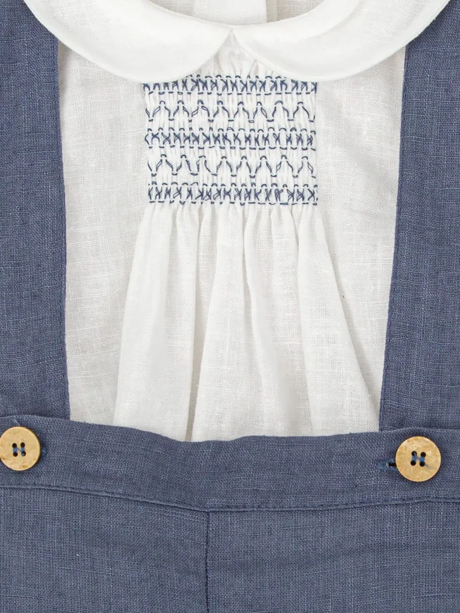 Le short à bretelles en coton bleu marine complète parfaitement la blouse à smocks. Sa coupe structurée apporte maintien et élégance, tout en laissant l’enfant libre de ses mouvements.