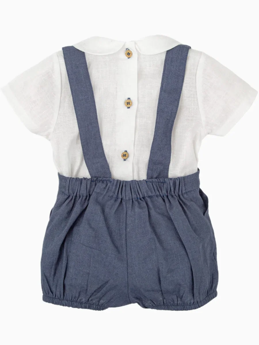 La blouse blanche à col rond apporte douceur et équilibre, tandis que le short à bretelles en coton bleu marine structure la silhouette avec caractère. Cet ensemble garçon bleu/blanc compose une tenue complète, soignée et élégante.