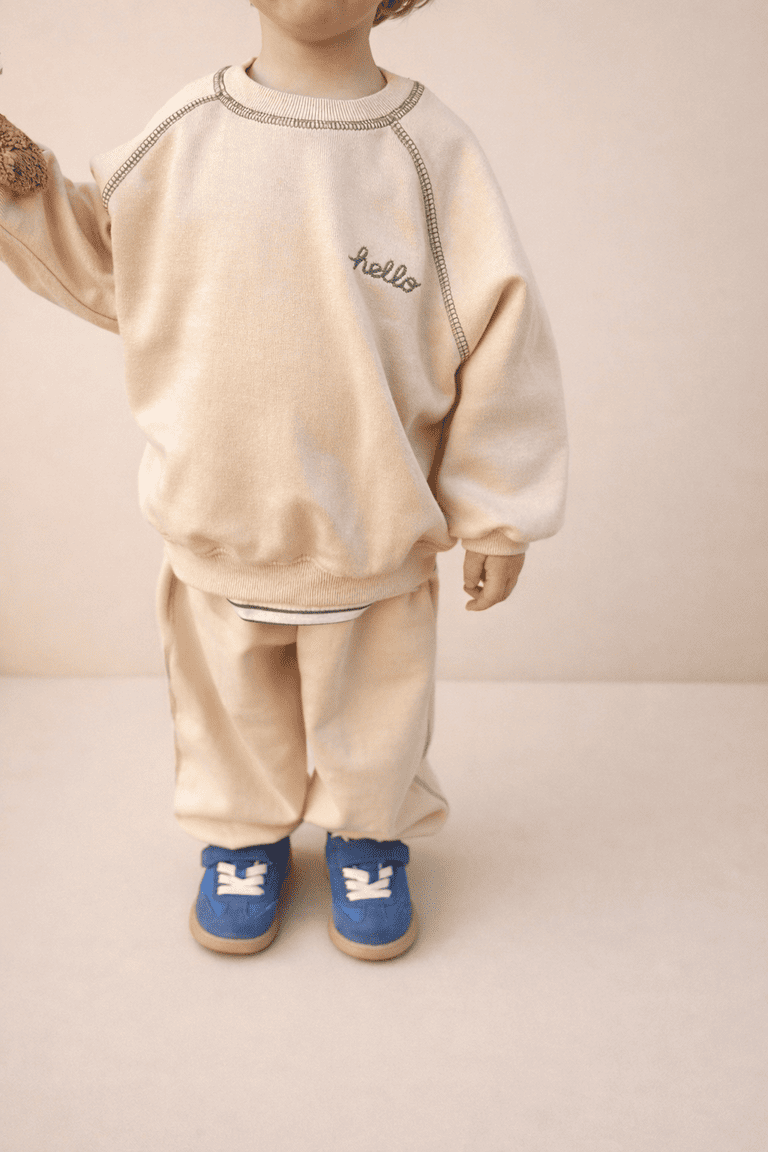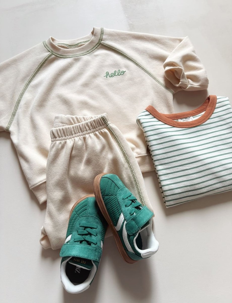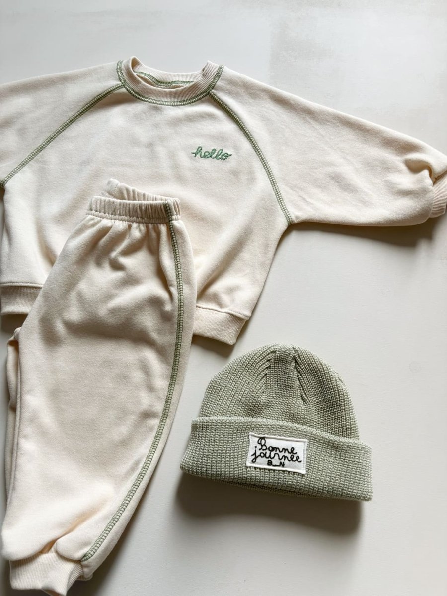 Confort et style avec cet ensemble jogging enfant beige ! Ses surpiqûres en broderie vertes lui assure un joli style vintage ! Guide tailles Le modèle porte la taille XS pour 80 cm. XS (80cm) S (82-90cm) M (90-100 cm) L(100-110 cm) XL(110 -122cm) JS(123-130cm)