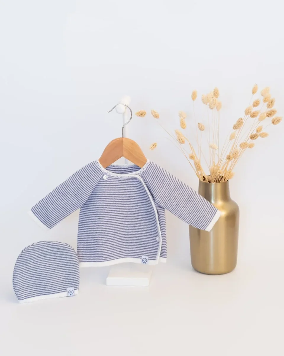 - Ensemble de naissance et bébé tricoté en France.
