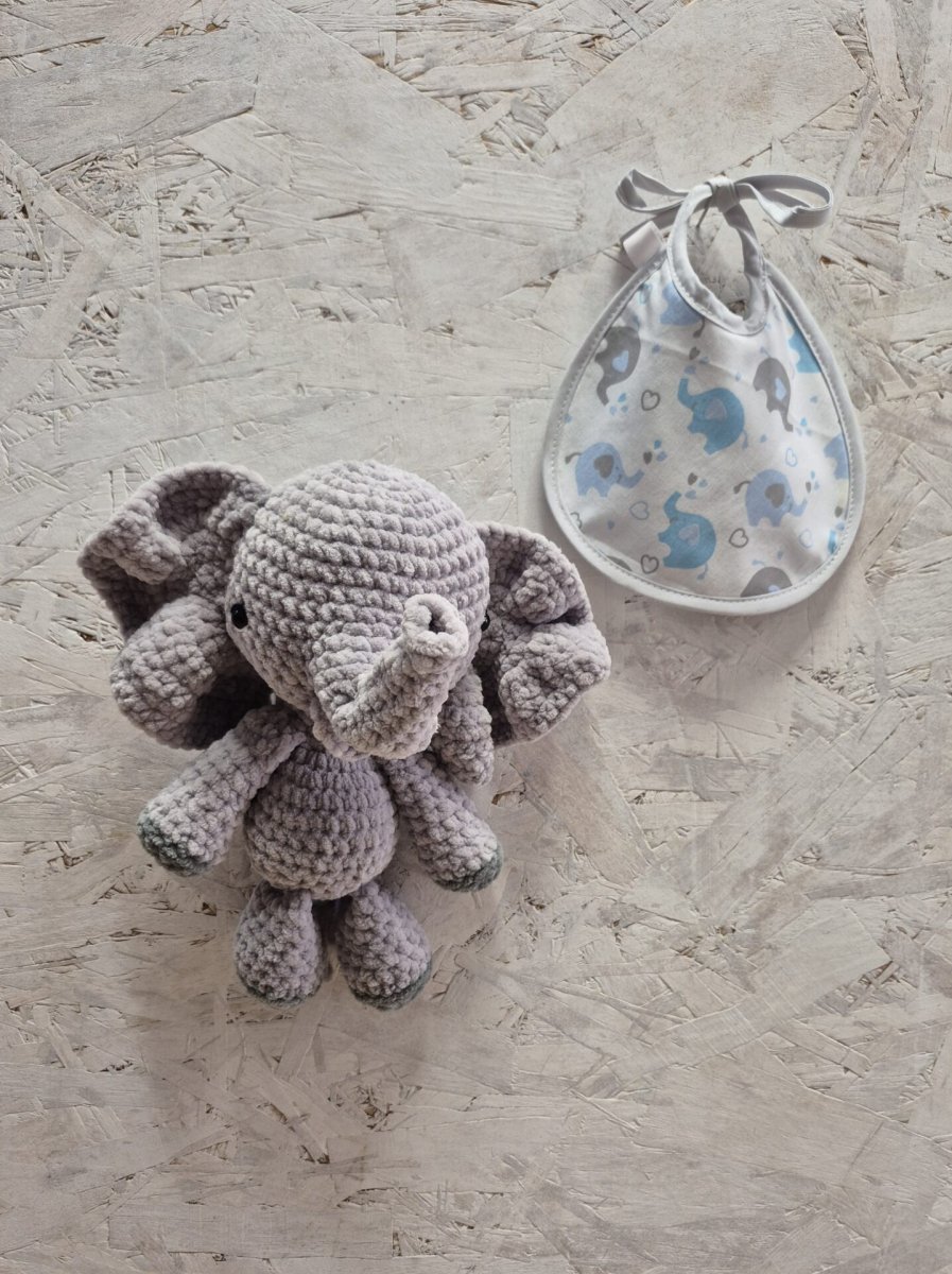 Ensemble naissance : doudou éléphant crochet + bavoir assorti – Cadeau fait main