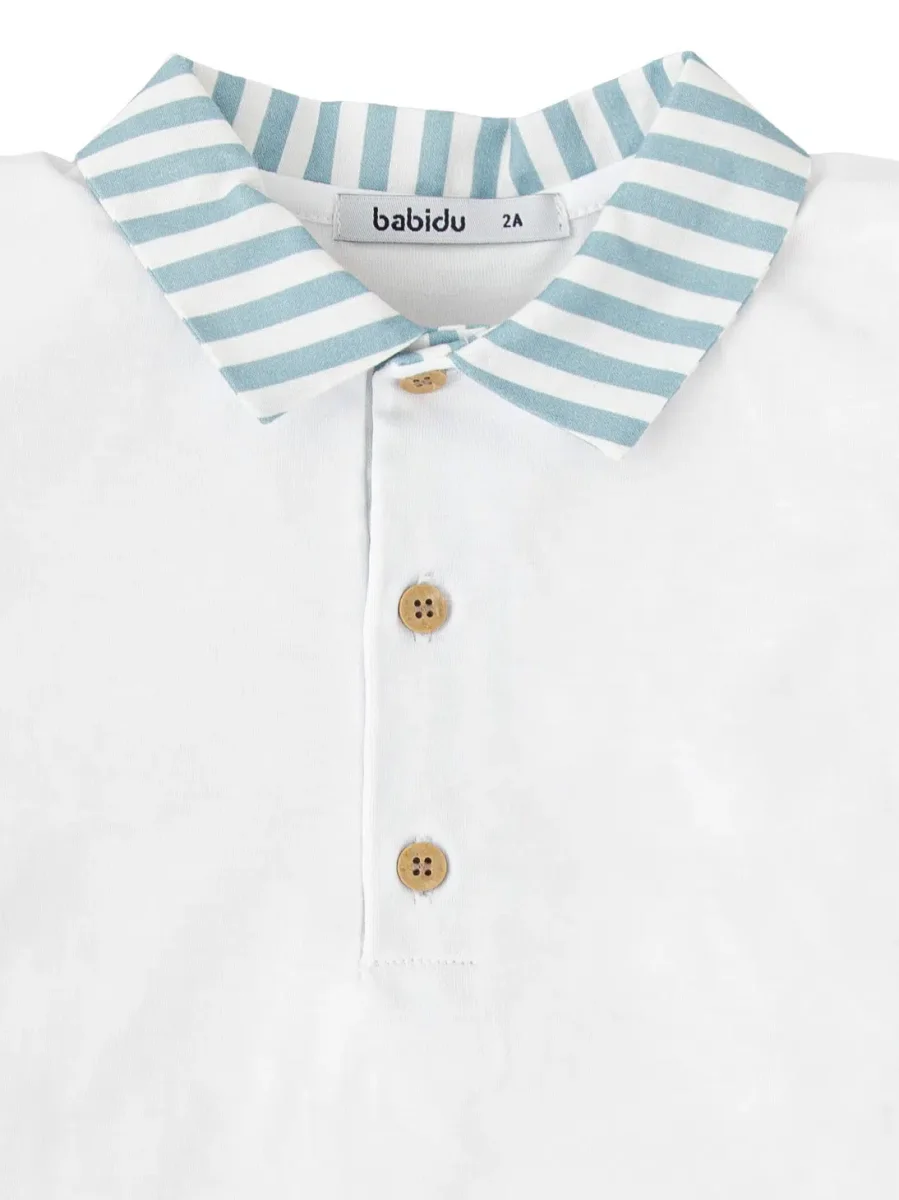 Le polo blanc en coton doux et léger est à la fois confortable et chic. Son col subtilement agrémenté du tissu rayé bleu et blanc apporte une touche raffinée et coordonnée. Le polo comporte trois boutons sur le devant, parfaits pour un habillage pratique tout en restant élégant.