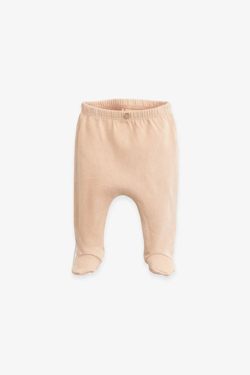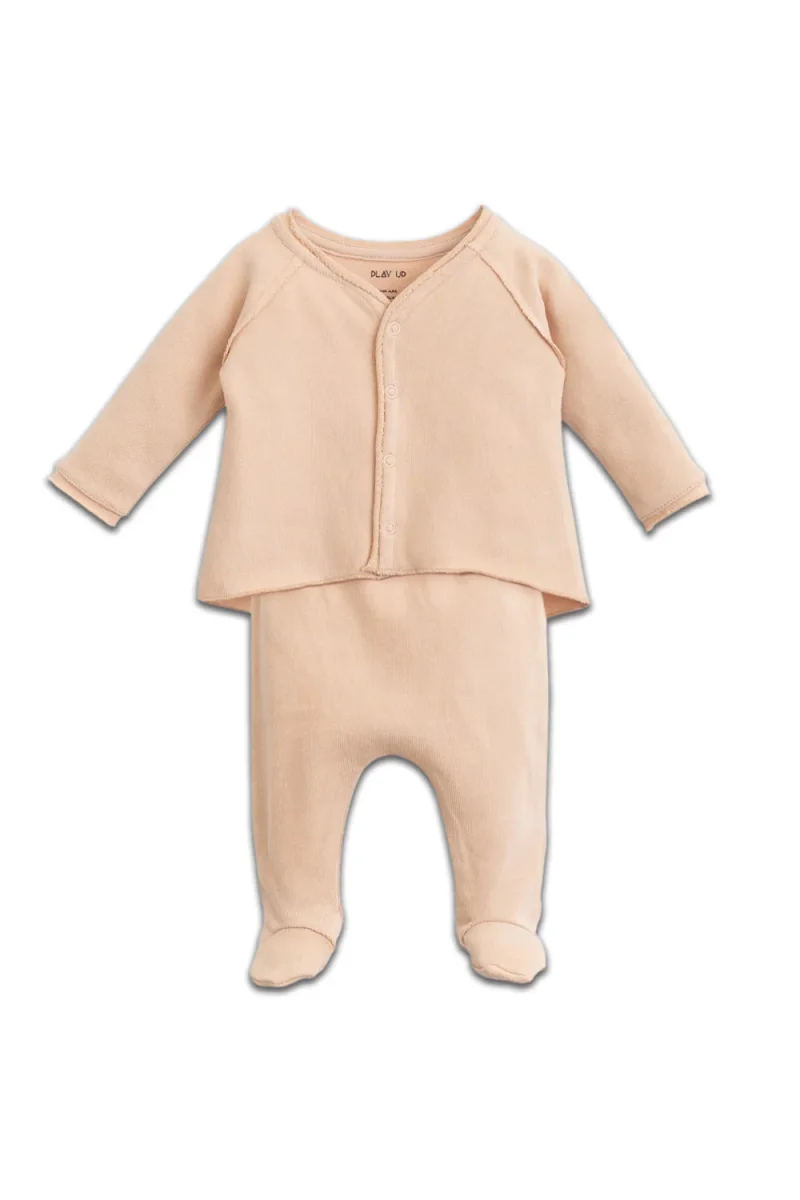 Cet ensemble pyjama est réalisé en jersey de coton biologique. La veste est un modèle à manches longues avec un col en V, une ouverture sur le devant. Elle est légèrement plus longue à l’arrière. Le pantalon a des pieds, une taille élastique et un bouton décoratif en noix de coco.