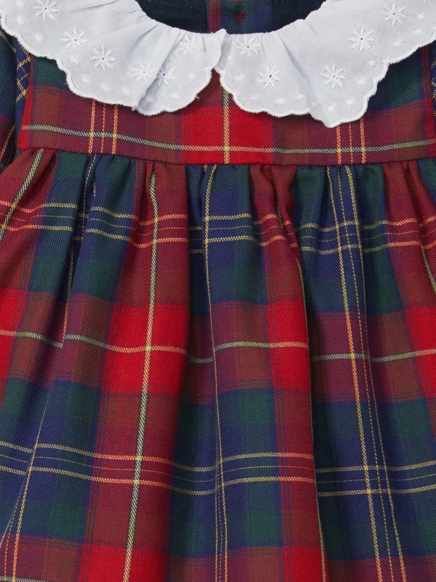 La robe se pare d’un imprimé écossais rouge, classique et chaleureux, qui traverse les saisons et les générations sans se démoder. Son col, délicatement orné de broderie anglaise, apporte une touche de poésie et de raffinement, transformant une simple tenue en une pièce élégante à porter aussi bien au quotidien que lors de moments précieux en famille. Les boutons en nacre, disposés dans le dos, facilitent l’habillage tout en ajoutant un détail chic et lumineux.