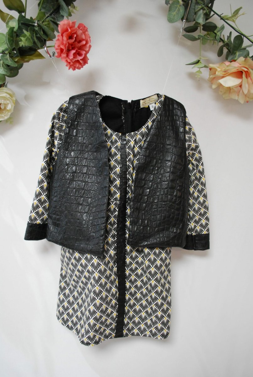 Ensemble Robe et Gilet ROCK : Cet ensemble robe et gilet est parfait pour une petite fille Rock and Roll . La robe est manches longues. Elle a un imprimé graphique pour la robe et le gilet est de de couleur noir. Sa composition est en coton et son gilet en simili .