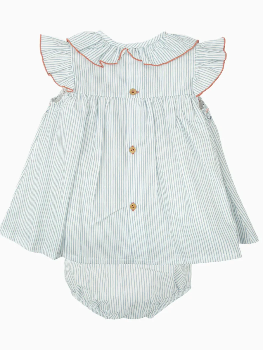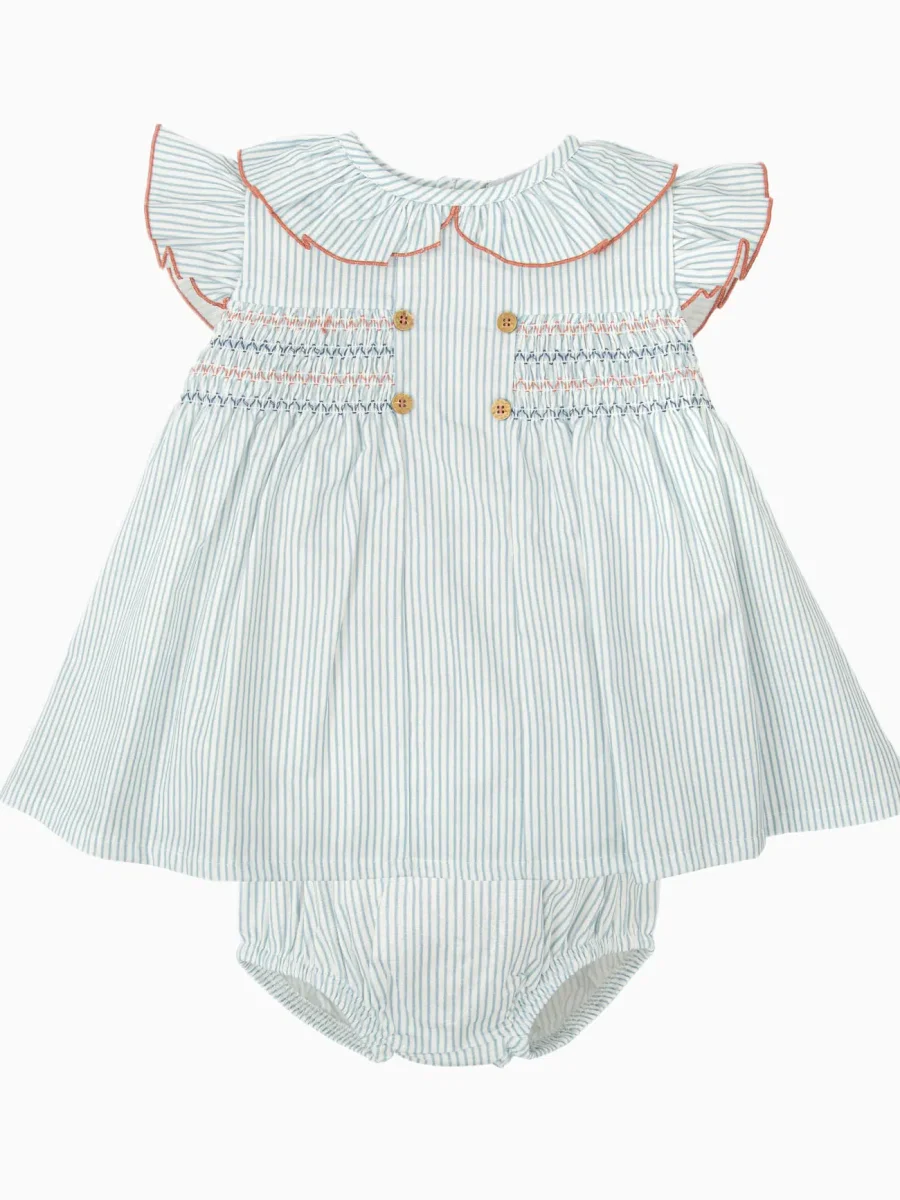 Ensemble robe rayée à smocks et bloomer – Bleu/blanc