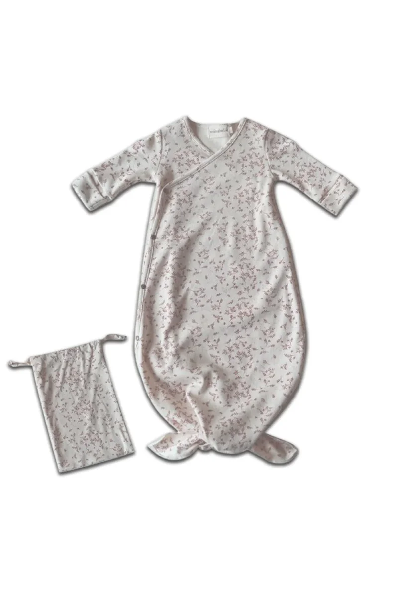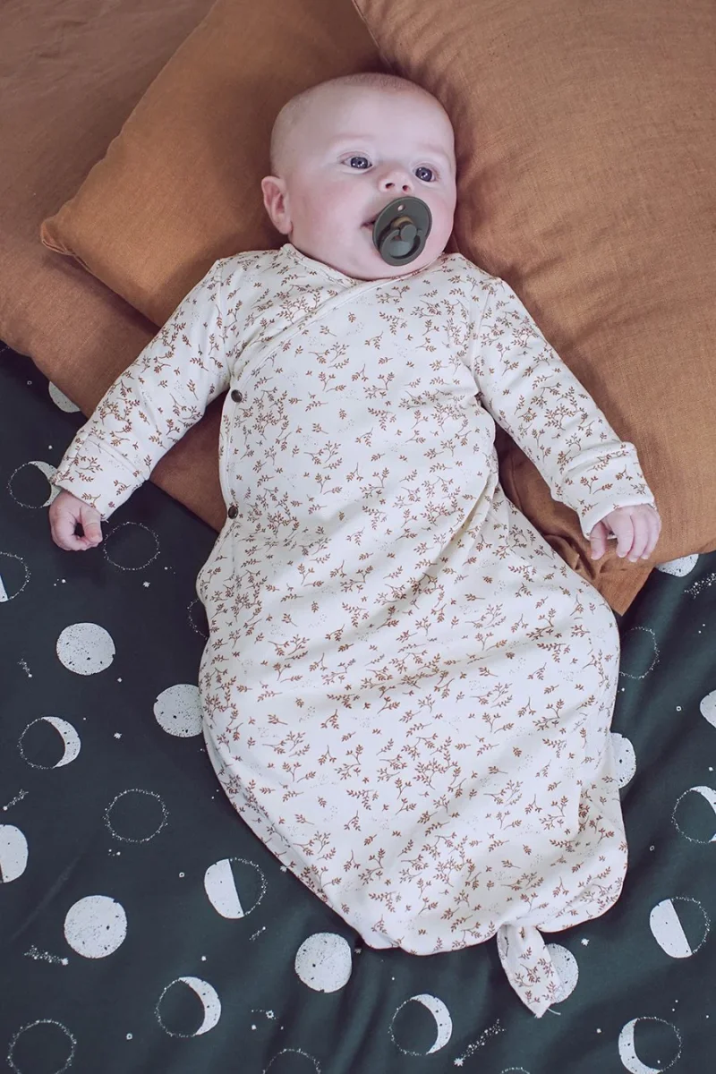 Gigoteuse nouée naissance en interlock de coton bio tout doux, A nouer pour adapter à la taille du nourrisson, Revers aux poignets à retourner en moufle,