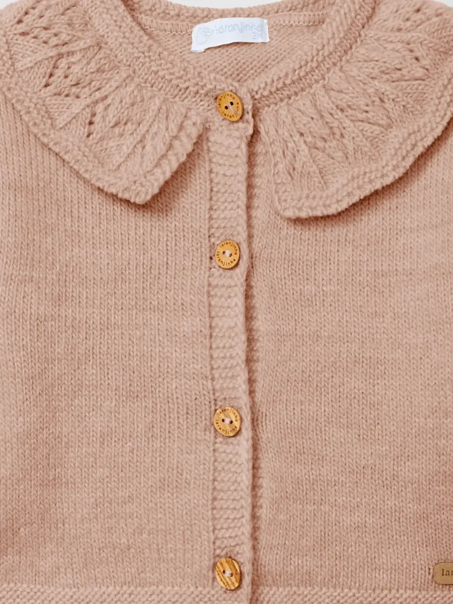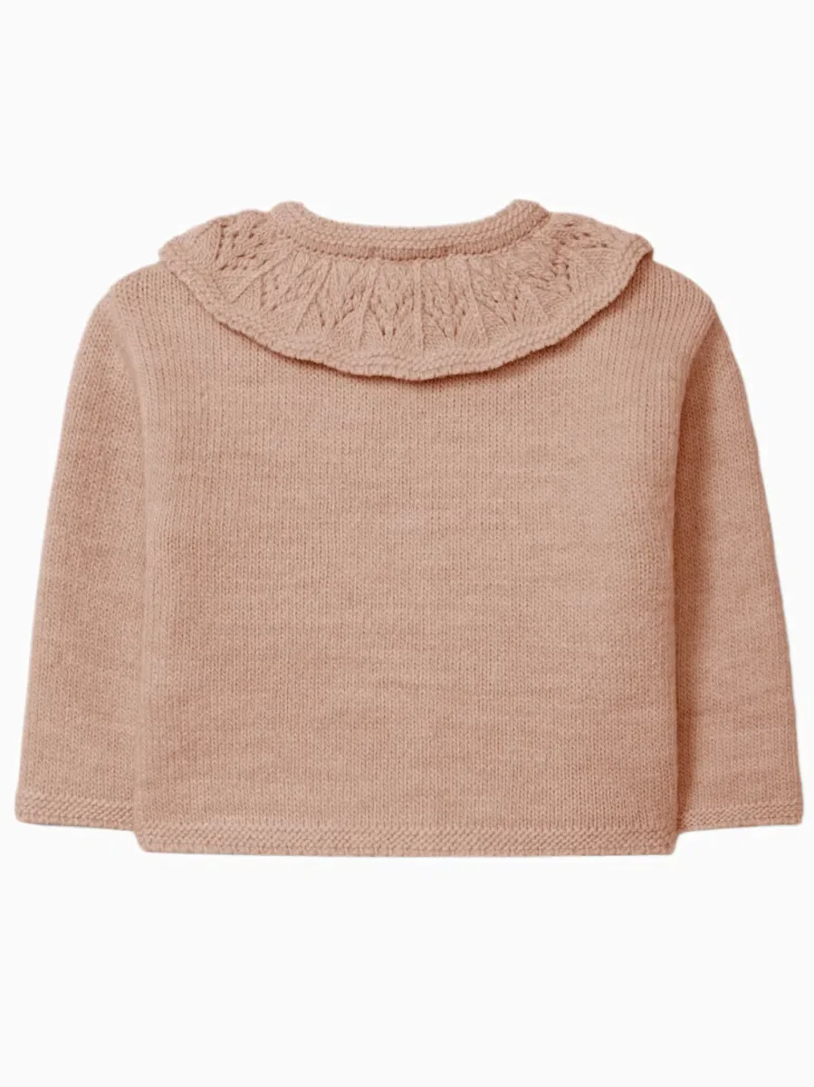 Son col froncé ajoute une note d’élégance enfantine, soulignant avec raffinement le cou de bébé sans le gêner dans ses mouvements. Ce détail travaillé transforme ce gilet en une pièce précieuse, parfaite pour les petites cérémonies comme pour embellir le quotidien.