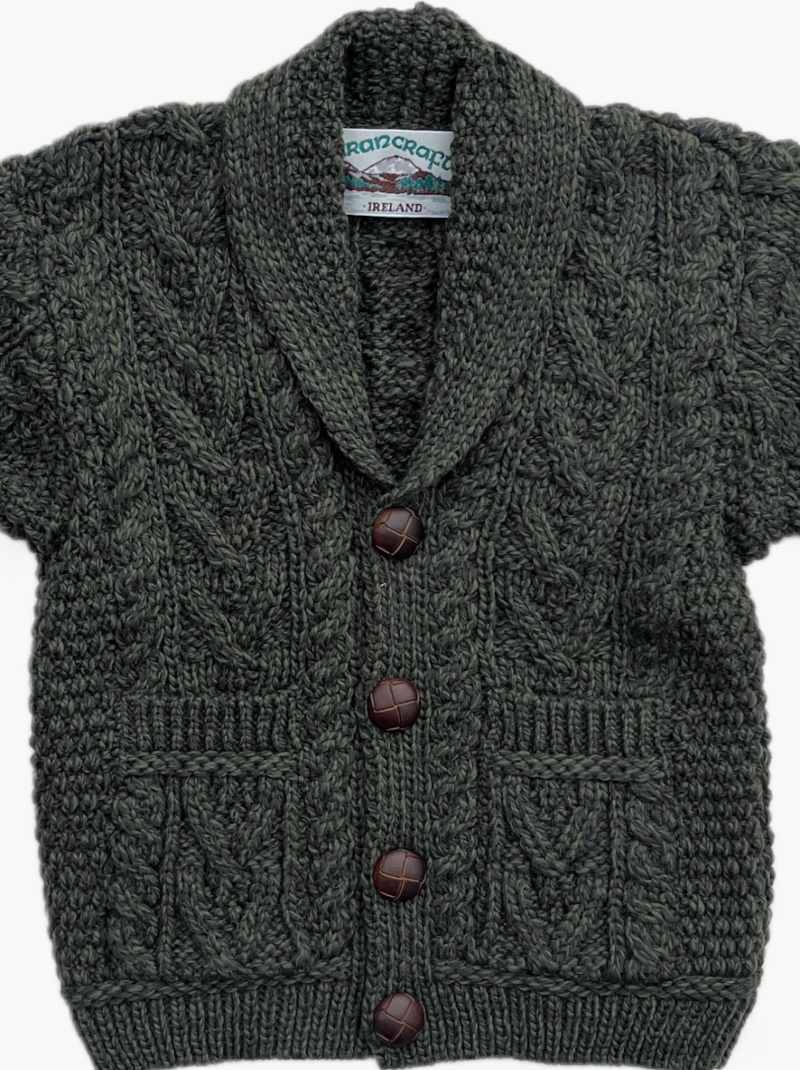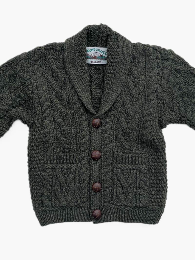 Le col châle, délicatement conçu, ajoute une touche de sophistication tout en protégeant le cou de votre enfant contre le froid. Le vert profond du gilet s’inspire des prairies verdoyantes et des collines d’Irlande, apportant une touche de fraîcheur et de nature à la garde-robe de votre bébé.