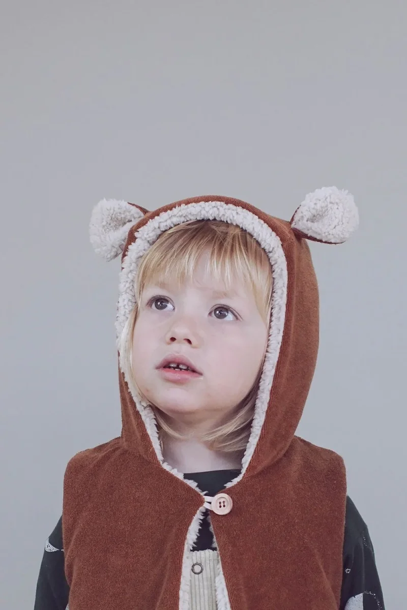 Un gilet sans manche à capuche avec petites oreilles, Entièrement doublé de fausse fourrure mouton ultra douce et chaud