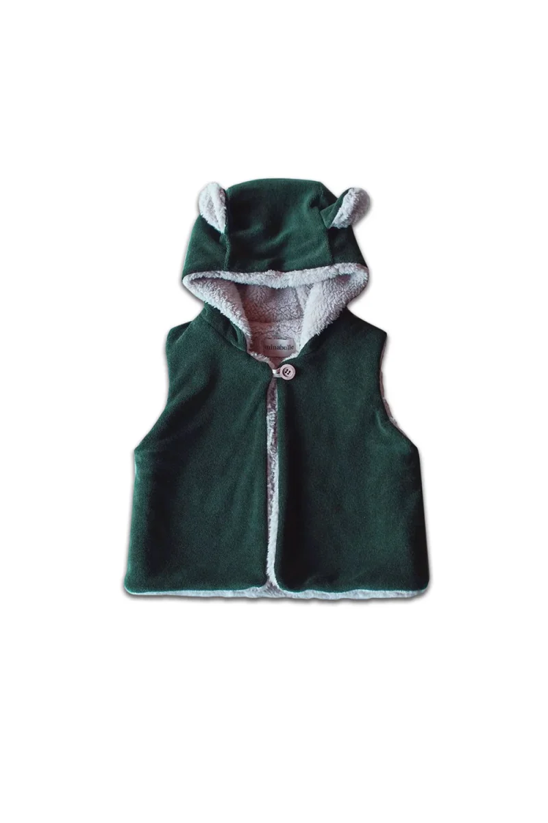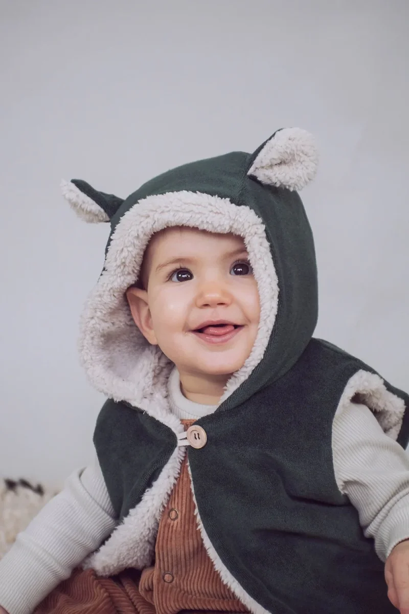 Un gilet sans manche à capuche avec petites oreilles, Entièrement doublé de fausse fourrure mouton ultra douce et chaud