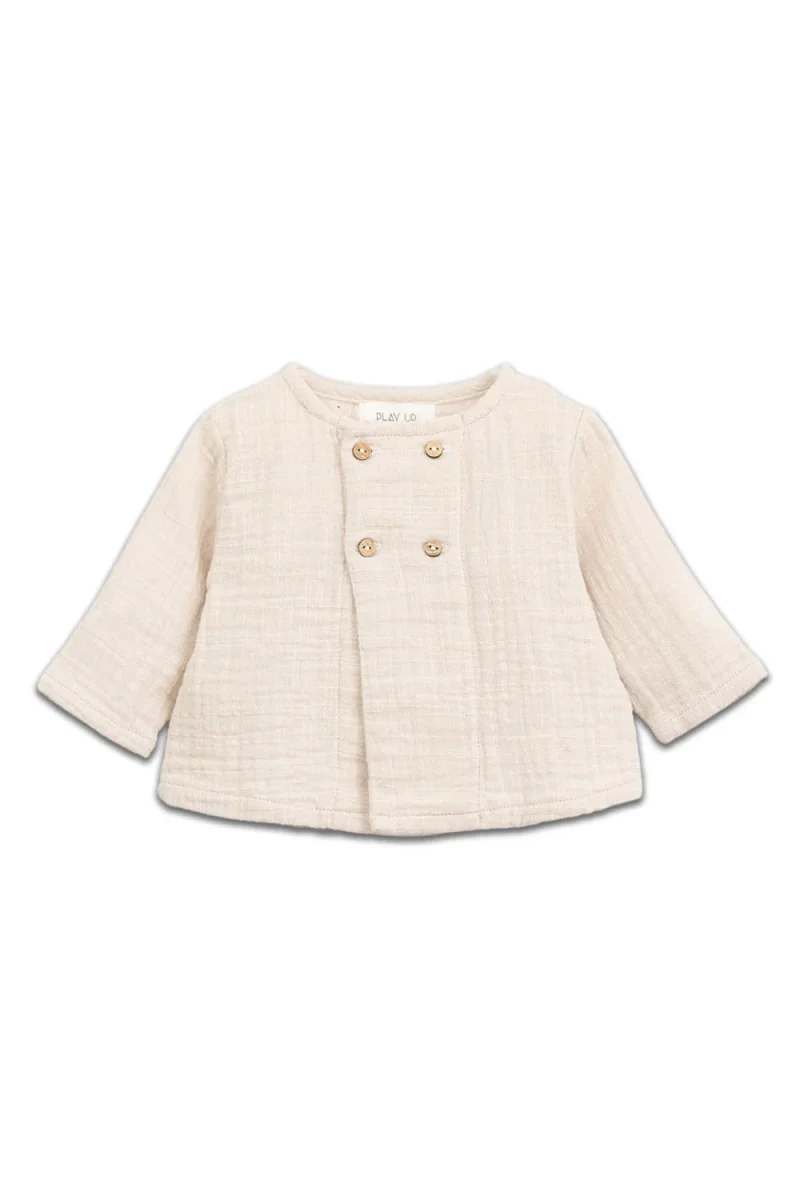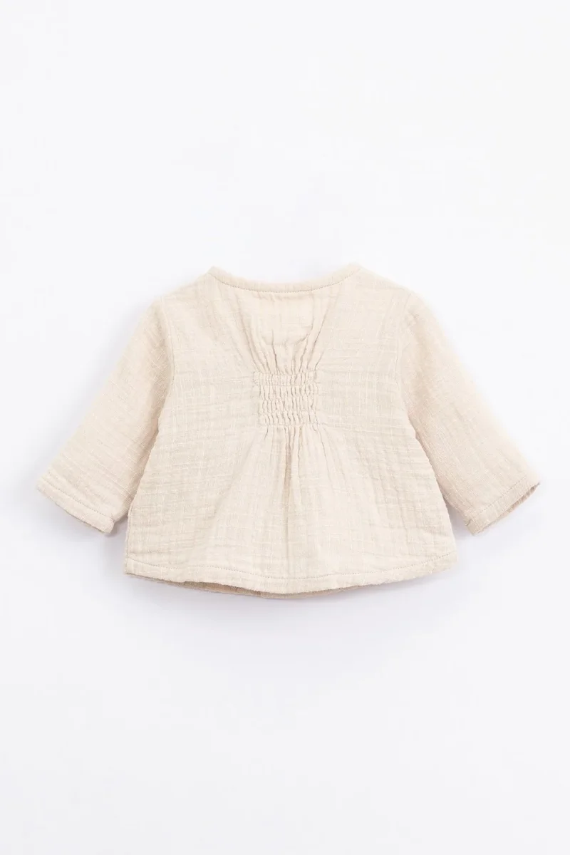 Ce gilet est réalisé en coton tissé. Le modèle a des manches longues et un col rond. Il s’ouvre par devant grâce à 4 boutons en noix de coco et il présente un joli détail à froufrou dans le dos.