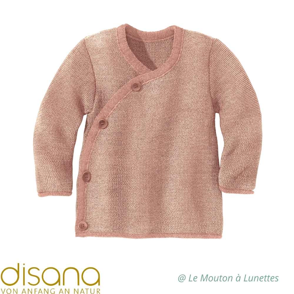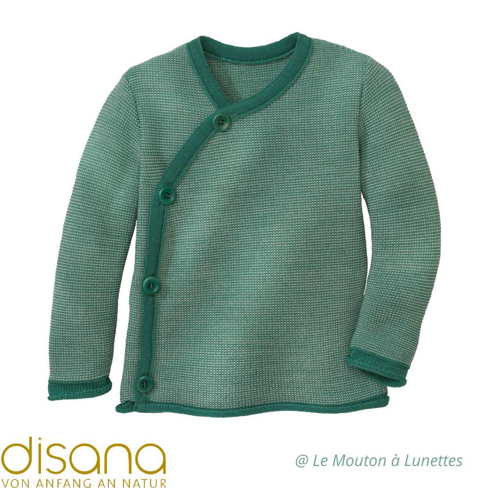 Gilet tricoté en laine mérinos biologique de la marque allemande Disana. Un vêtement de qualité, chaud et souple qui sera adapté à la peau sensible de bébé dès la naissance. Facile à enfiler grâce à quatre boutons en ivoire végétal (noix tagua).