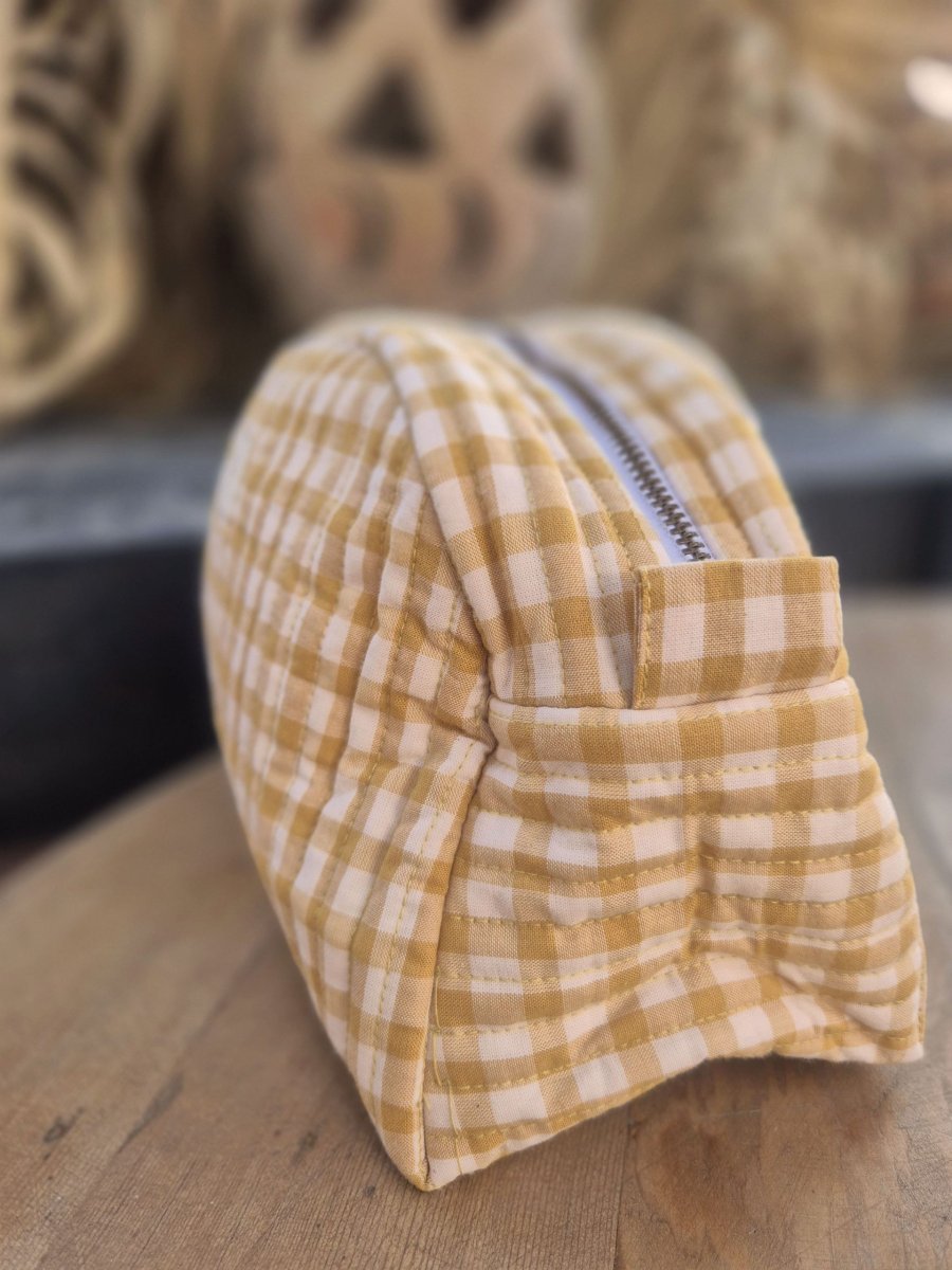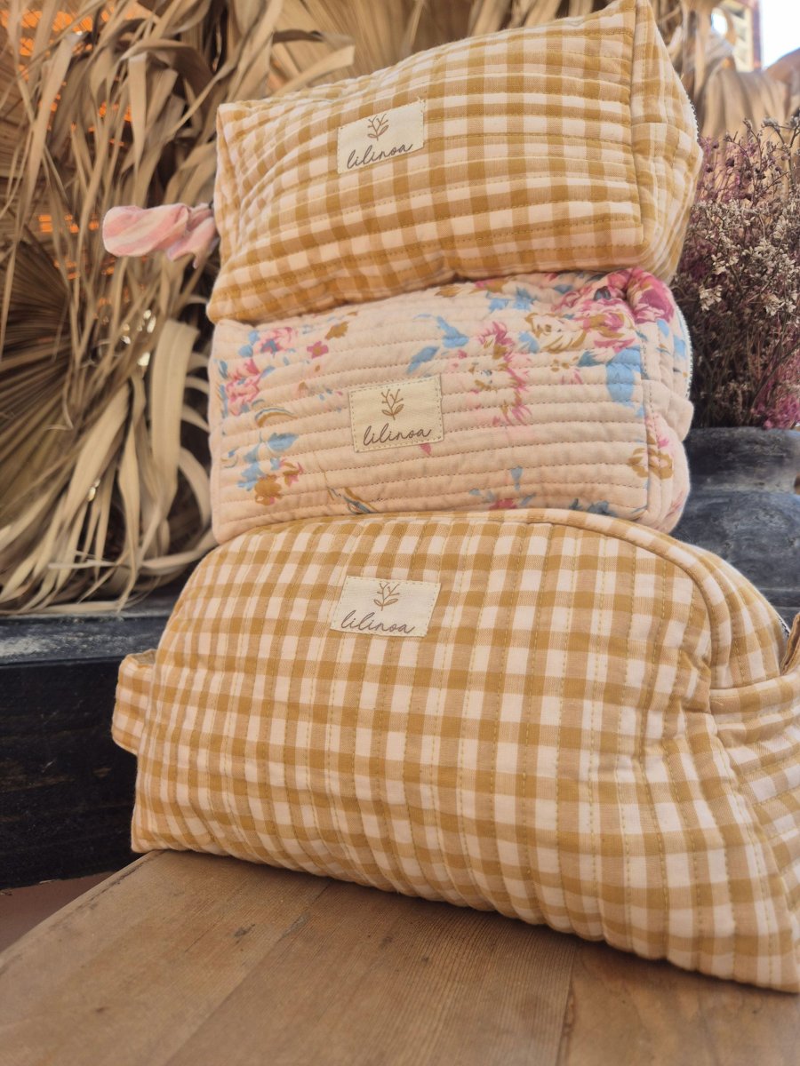 La grande trousse de toilette Nina séduit par son élégant imprimé vichy et son tissu matelassé quilté, réalisé selon une technique traditionnelle indienne. Spacieuse et pratique, elle permet de ranger facilement maquillage, produits de soin et accessoires de toilette tout en apportant une touche raffinée à votre quotidien.
