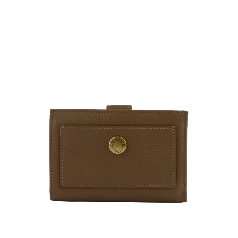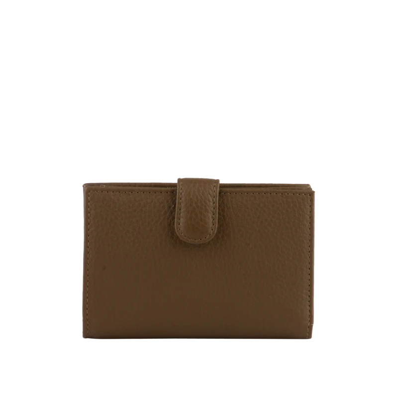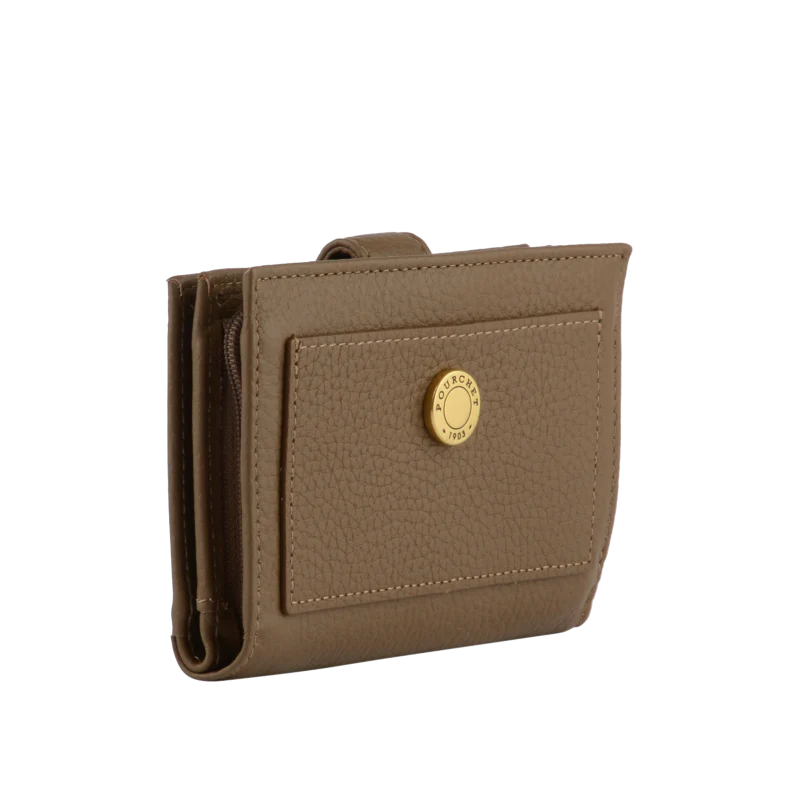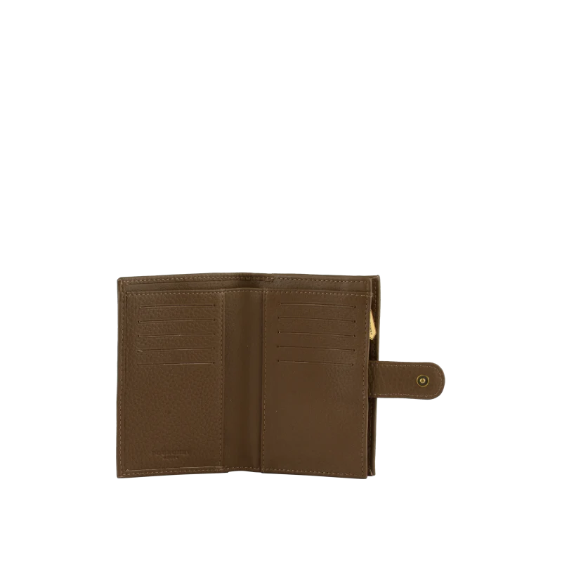 La fermeture à pression assure la sécurité de son contenu, tandis qu’un bouton décoratif en métal ajoute une touche de sophistication. La couleur taupe, une teinte neutre, crée des nuances légèrement différentes selon la lumière, rendant ce portefeuille unique.