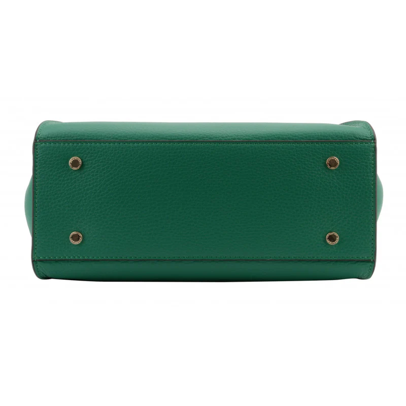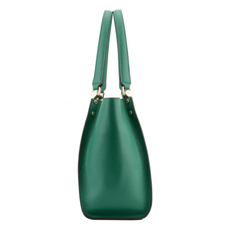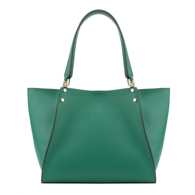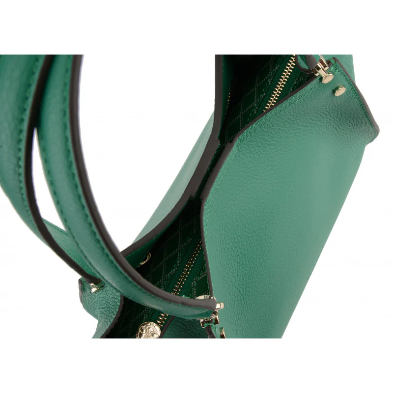 Conçu pour le confort, il est équipé de deux poignées en cuir qui permettent de le porter facilement à la main ou sur l’épaule. Les détails en métal doré, tels que les rivets et les attaches, ajoutent une touche de sophistication et de contraste à la couleur émeraude.