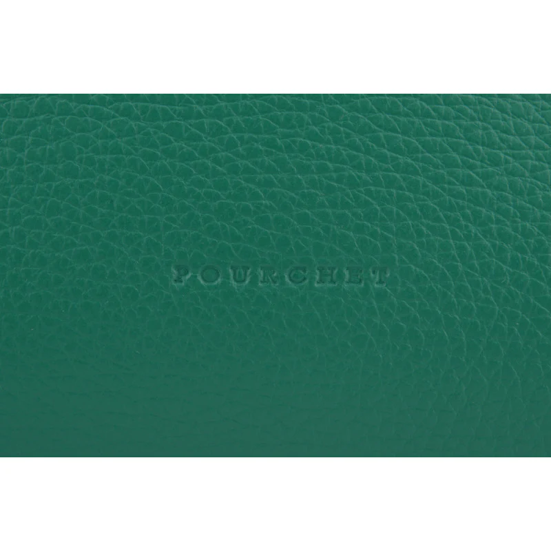 La base du sac est dotée de petits pieds en métal, protégeant ainsi le cuir des surfaces et renforçant sa durabilité. Ce petit sac émeraude de Pourchet est donc non seulement élégant, mais également conçu pour résister à l’épreuve du temps.