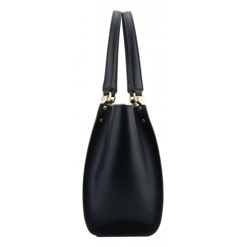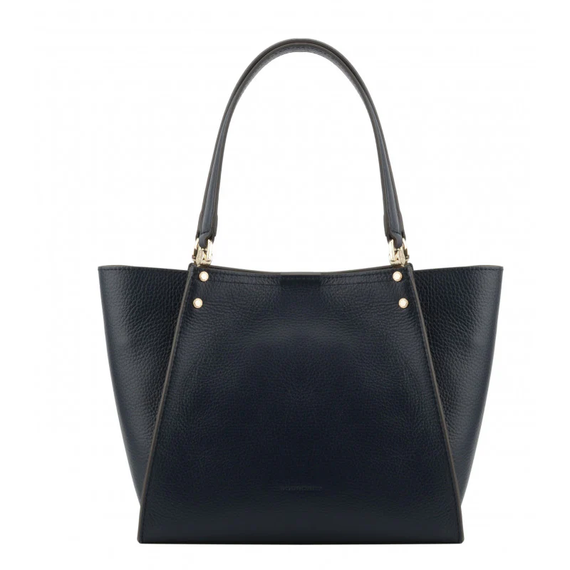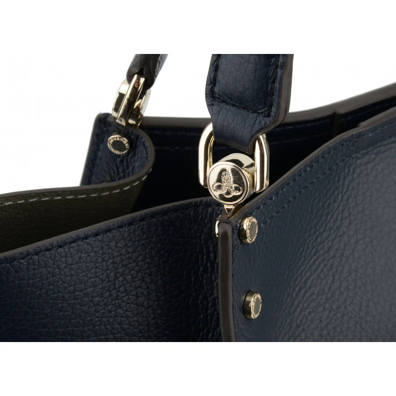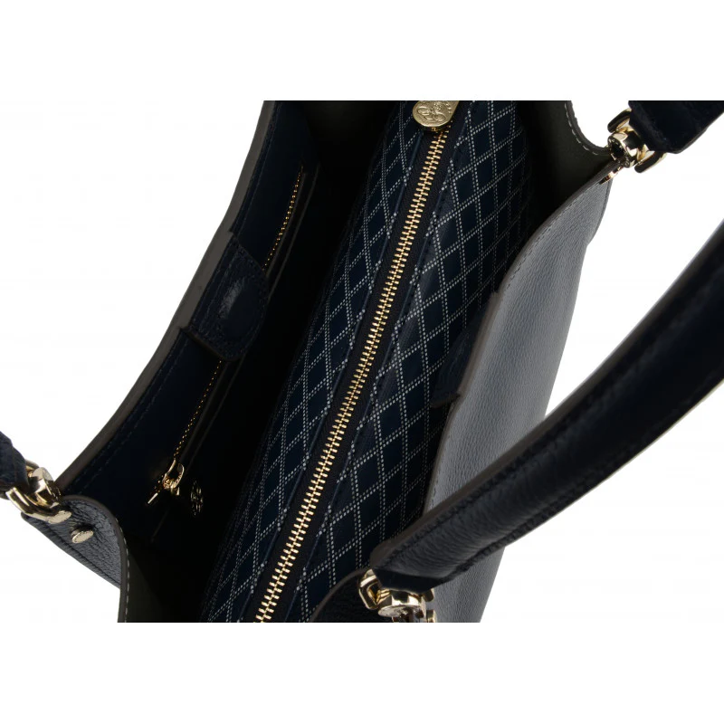Les anses robustes et confortables permettent un port à l’épaule ou à la main, fixées par des rivets dorés qui apportent une touche de luxe. Le sac se ferme par un système de pression, offrant un accès facile à son contenu.