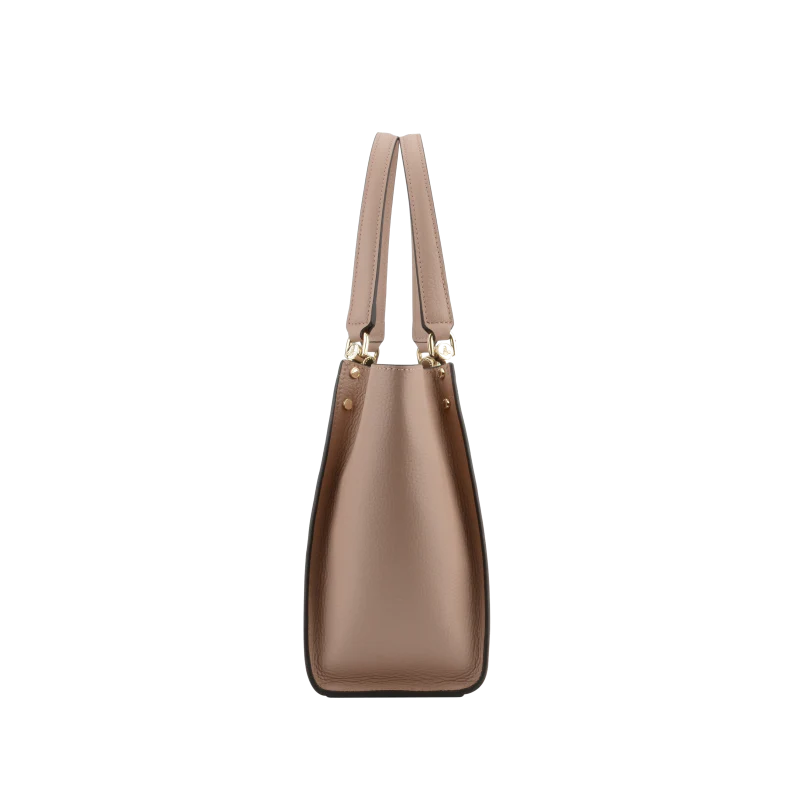 Les dimensions de ce sac sont de 35 x 23 x 11 cm, et il est équipé de deux poignées en cuir, renforcées par des éléments métalliques dorés qui ajoutent une touche de sophistication. Des rivets dorés sur les côtés apportent une note de style supplémentaire, tandis que la marque est discrètement embossée sur le cuir, témoignant de la qualité du produit.