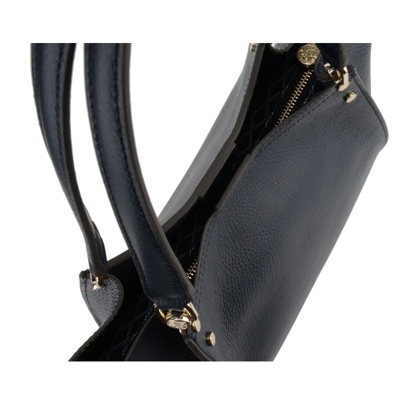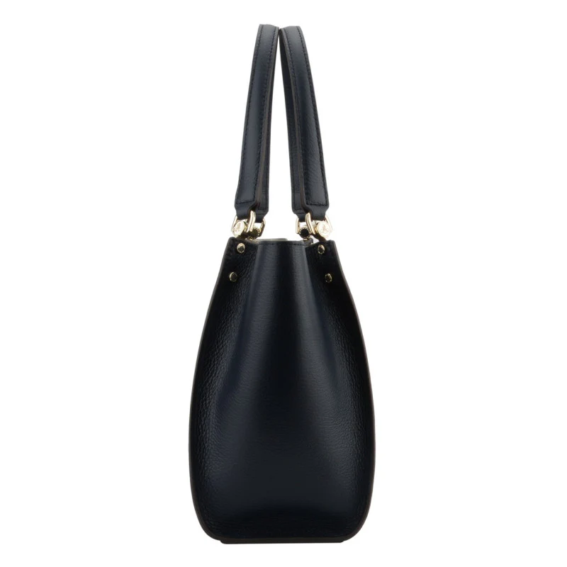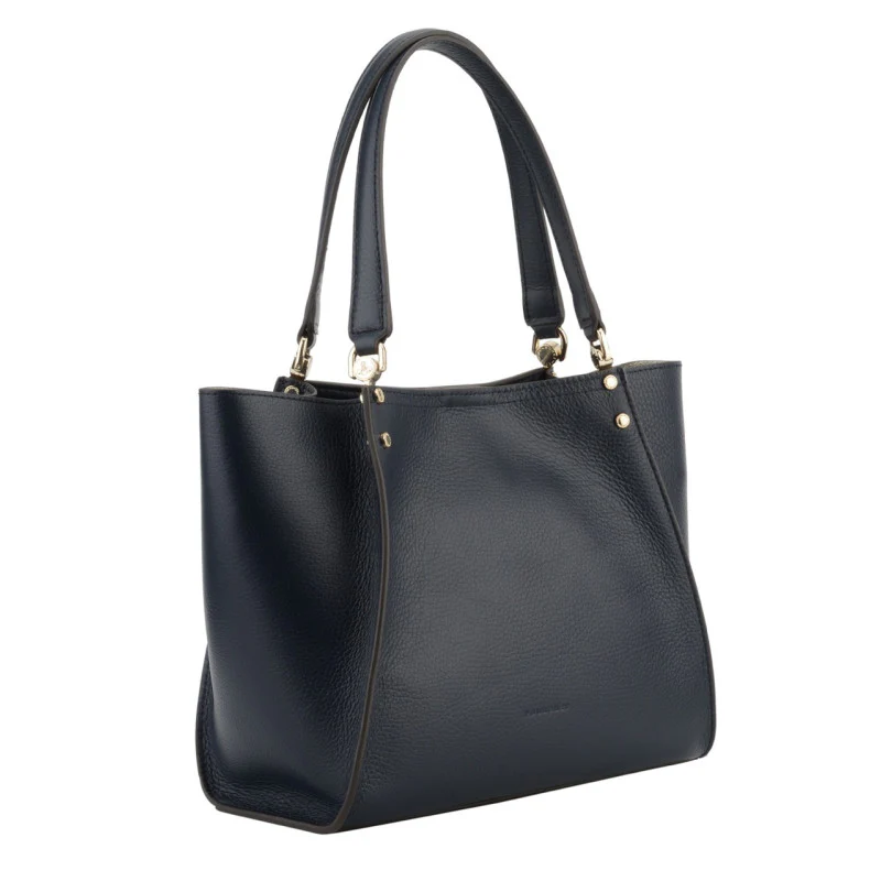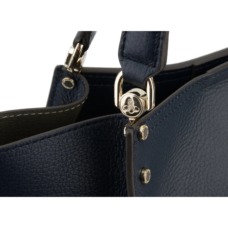 Ce sac se distingue par sa silhouette structurée et ses bords légèrement arrondis, lui conférant une allure moderne et chic. Doté de deux poignées en cuir noir, il est également renforcé par des éléments en métal doré qui ajoutent une touche de sophistication à son design.