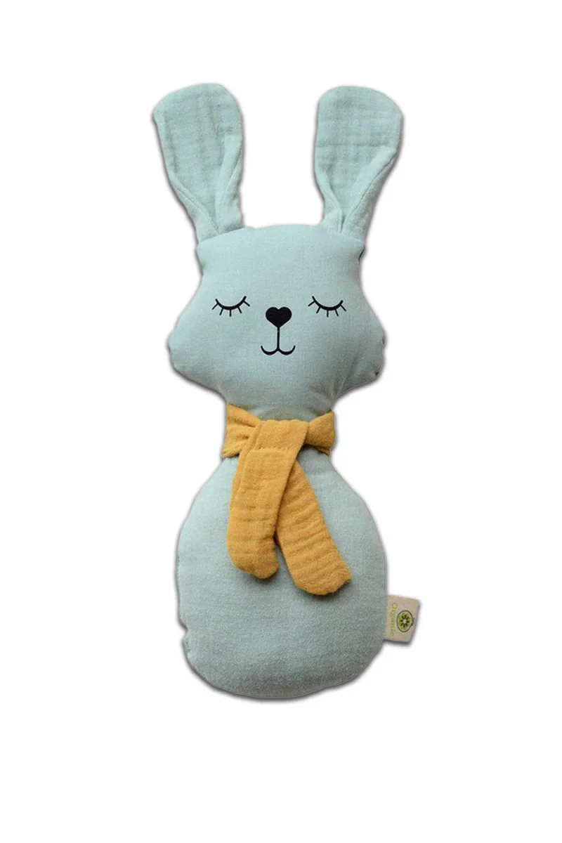 Hochet Lapin Bleu pour bébé fabriqué en tissu 100% coton bio certifié Gots et rembourré de fibre de maïs, matière végétale. La simplicité de ses formes et de son visage stimulent l’imagination de votre enfant. Ses dimensions sont parfaites pour la bouche et les petites mains de bébé. Les couleurs et le son du grelot attirent l’attention du bébé et contribuent au développement du toucher et de l’audition. Produit bio et végan.