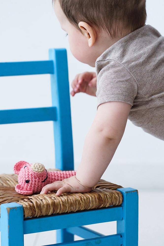 Hochet en crochet en forme de cochon fait main de manière artésanale. Facile à saisir, de couleurs vives et attrayantes. Pour stimuler le développement du toucher et de l’audition des jeunes enfants.