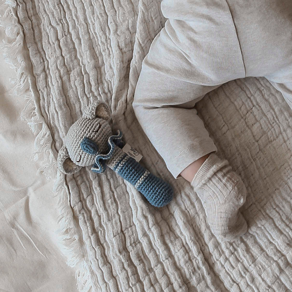 Ce hochet classique avec sa petite tête de koala est facile à manipuler pour les bébés et fait du bruit grâce à son grelot quand on le secoue.