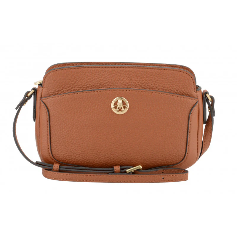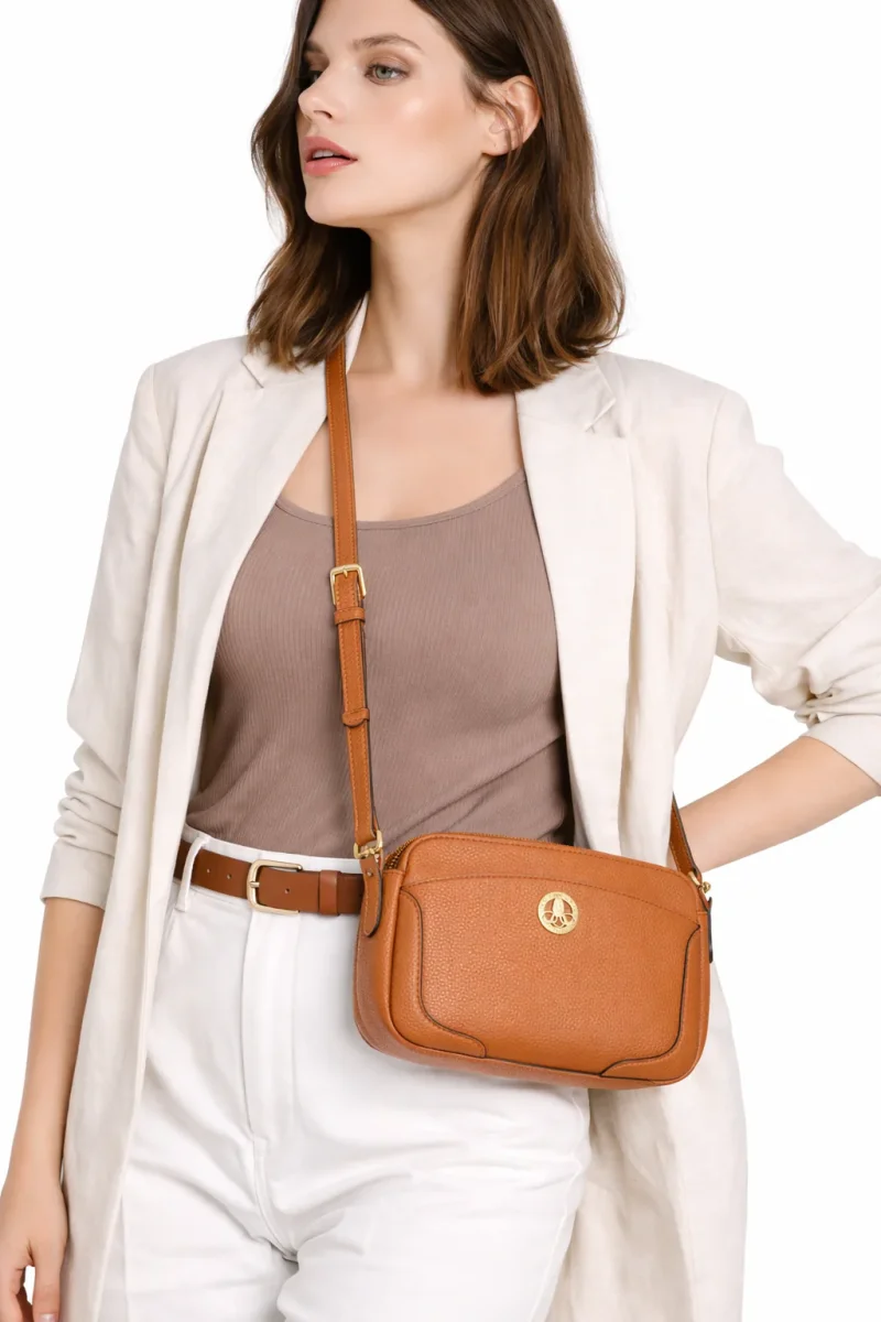 Le logo doré de la marque sur le devant ajoute une note de luxe, faisant de ce sac un accessoire idéal pour toutes les occasions. Que ce soit pour une sortie quotidienne ou une occasion spéciale, ce sac porté travers camel est un choix parfait pour compléter n’importe quelle tenue.