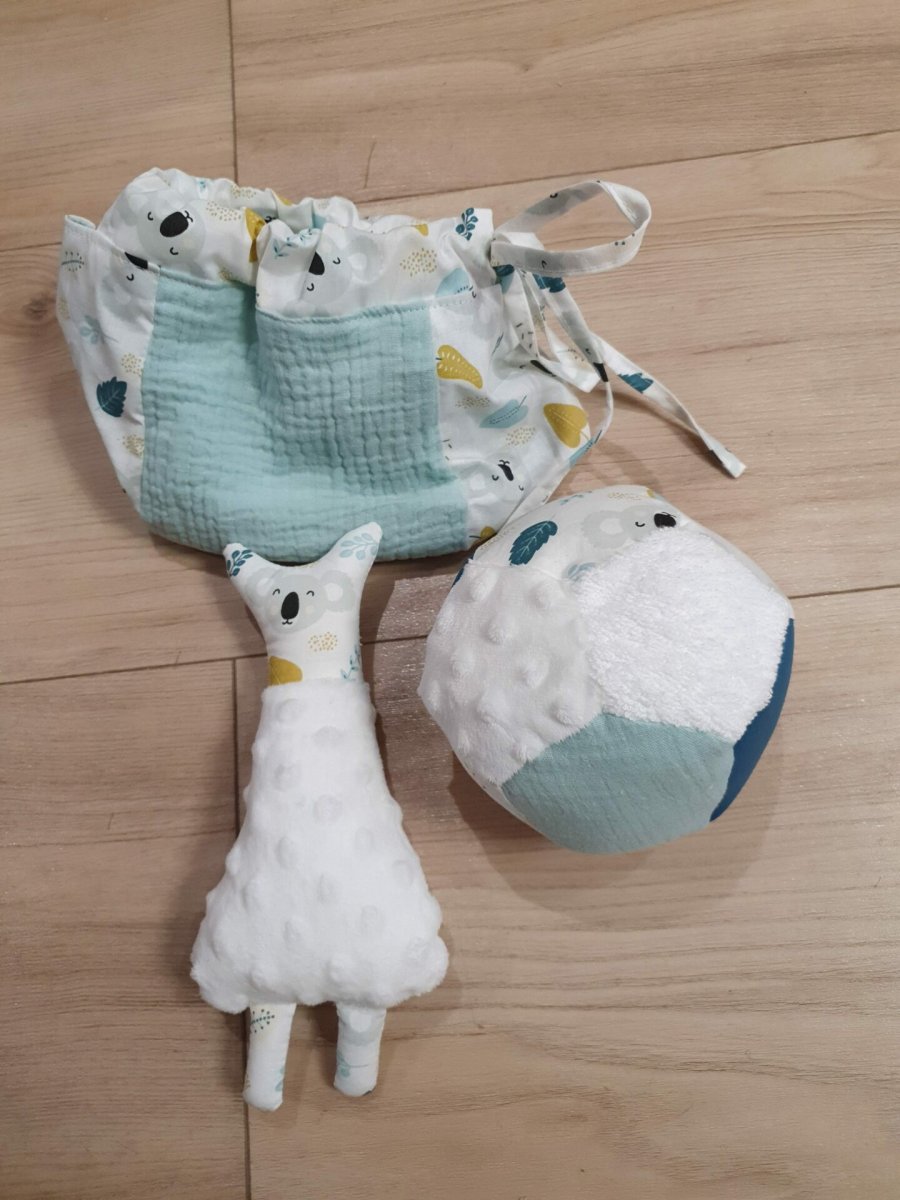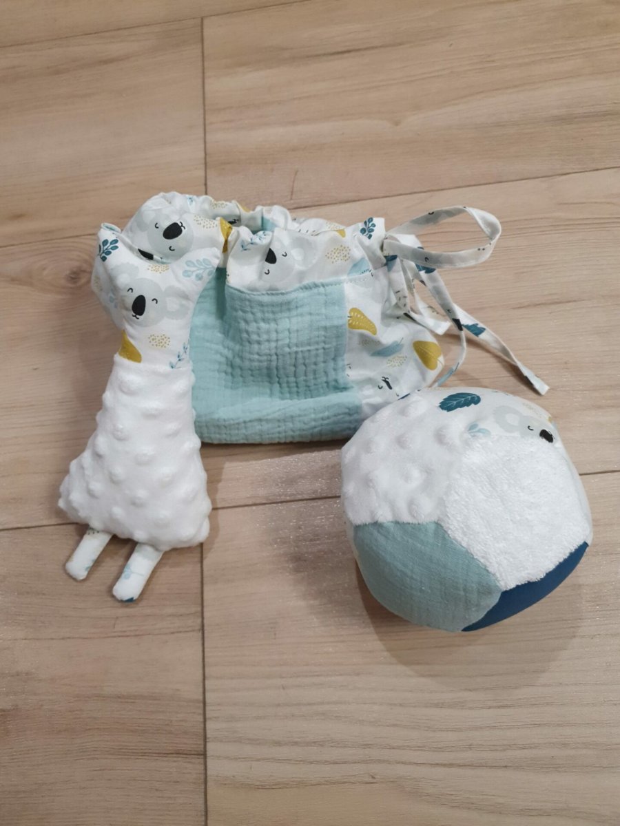 Jouet bébé et doudou en tissu BALDOU : Sac contenant jouet et doudou en tissu pour bébé, idéal pour jouer avec. Ce petit sac en tissu comprend un ballon sensoriel et un doudou tout doux en polaire et coton.