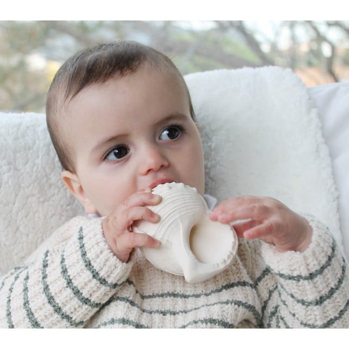 Le jouet de dentition coquillage de Lanco, inspiré de la nature et de la mer. C’est un anneau de dentition conçu pour transmettre l’appréciation et la curiosité pour la nature. Il est fait de caoutchouc naturel totalement biodégradable et durable. Fabriqué à la main et hermétique, il est totalement sans danger pour bébé. Sa texture est rugueuse pour stimuler les gencives de bébé, procurant une sensation de soulagement très agréable. Il favorise la stimulation sensorielle grâce à ses différents reliefs et favorise la coordination œil-main.