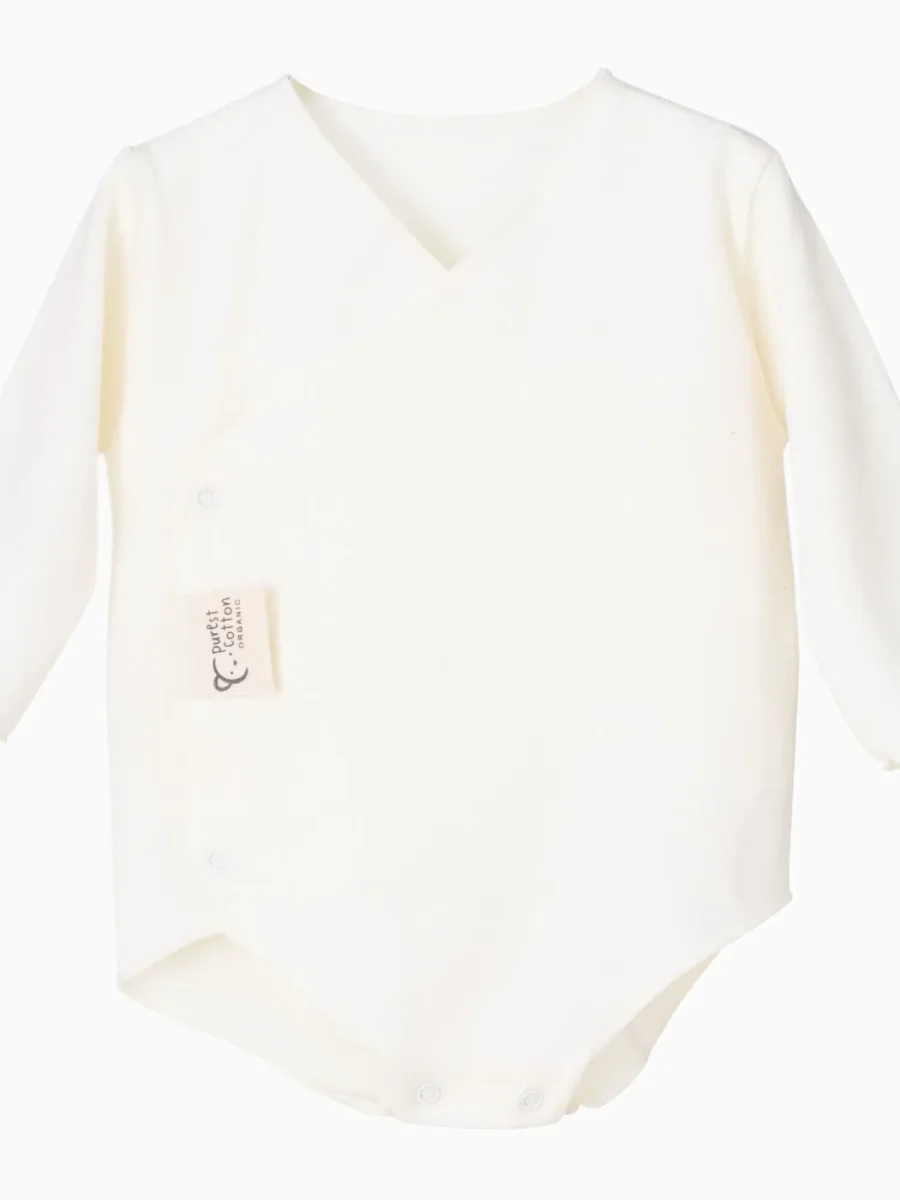 Bodies de naissance croisés extra-doux Manches longues Boutons-pression côté et entrejambe 100% coton biologique Fabriqués en Espagne Ces bodies taillent normalement. Choisissez la taille habituelle.