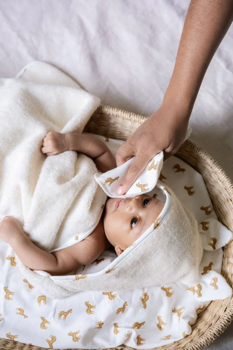 – Un coté éponge de coton unie, un côté en jersey de coton imprimé Zebra, tous deux très absorbants