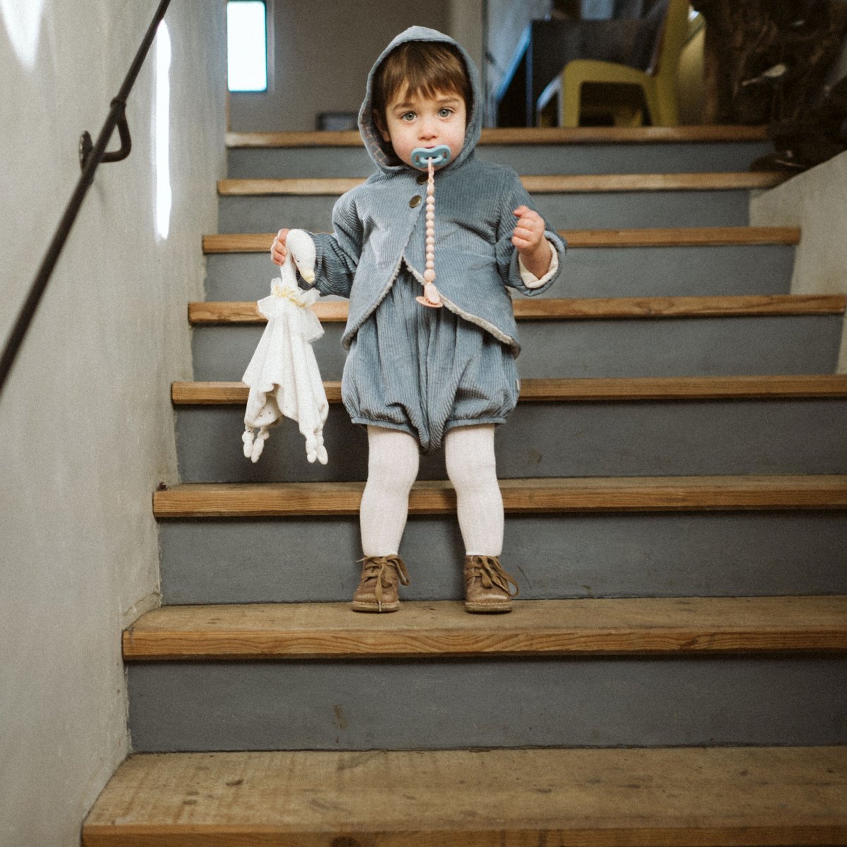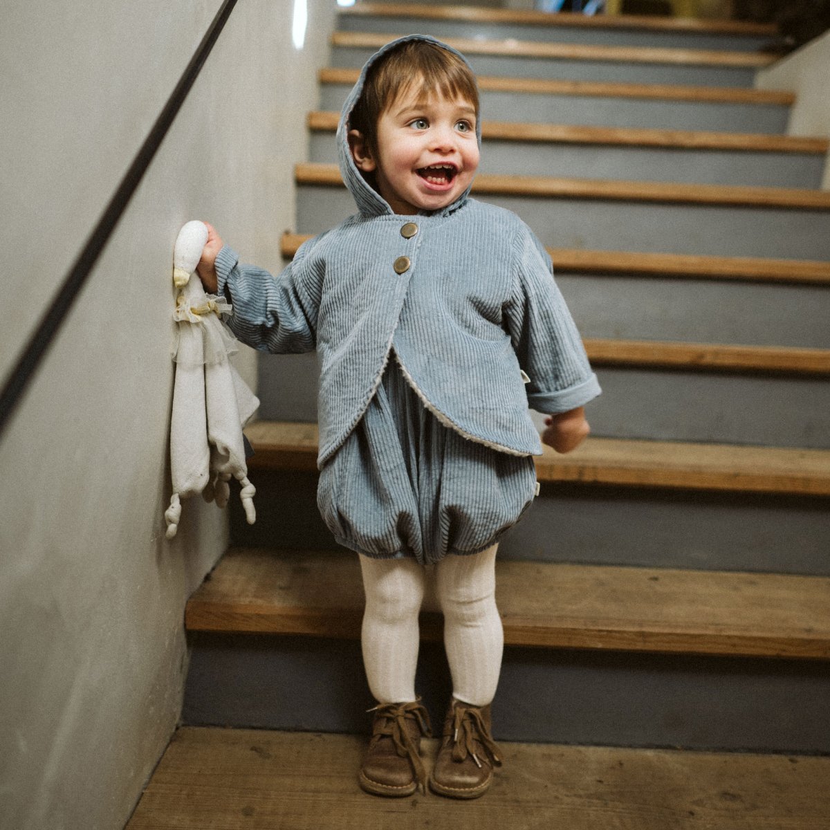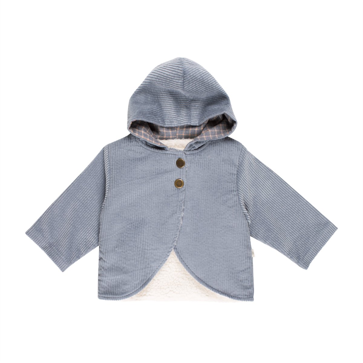Manteau bébé et enfant en velours, 100% coton, buste doublé moumoutte écru (polyester recyclé), capuche doublée coton carreau bleu
