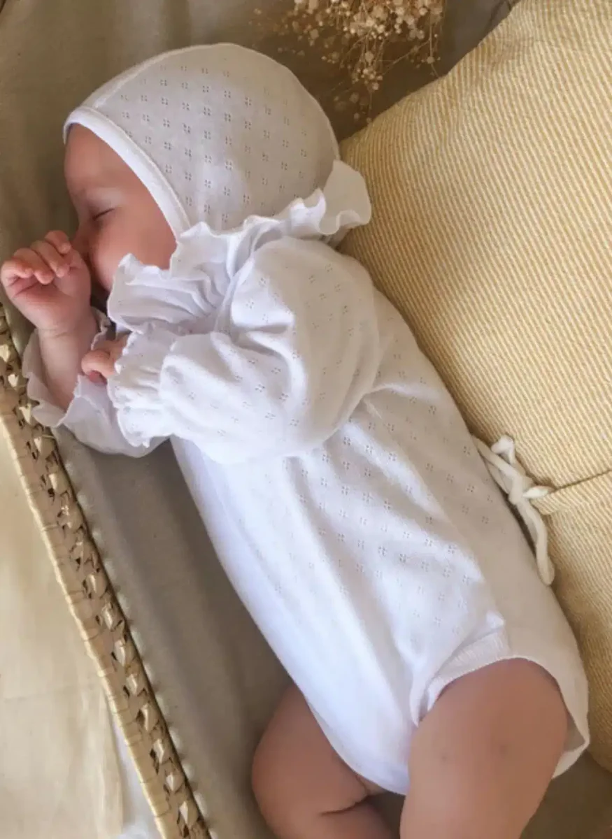 Le body, facile à enfiler, maintient bien au chaud les tout-petits, tandis que le béguin complète la tenue avec une touche rétro pleine de tendresse.