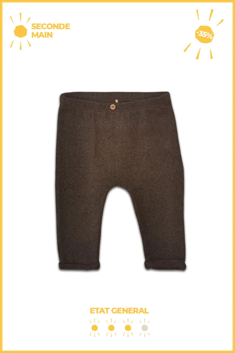 Ce pantalon est en coton biologique à points de jersey. Il est molletonné à l’intérieur et propose une taille élastique et un bouton décoratif en noix de coco.