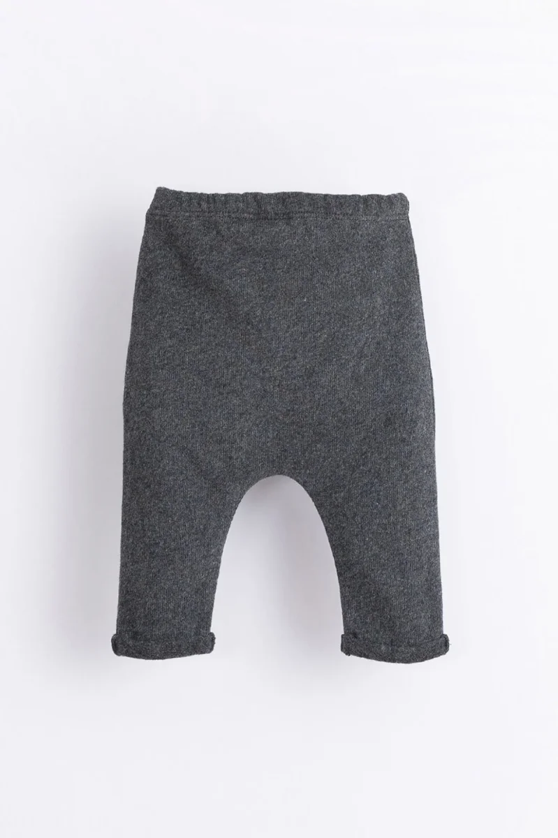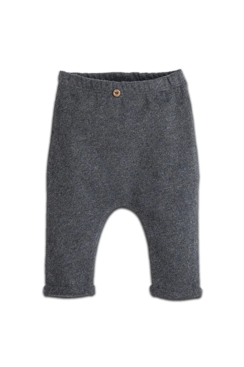 Ce pantalon est en coton biologique à points de jersey. Il est molletonné à l’intérieur et propose une taille élastique et un bouton décoratif en noix de coco.