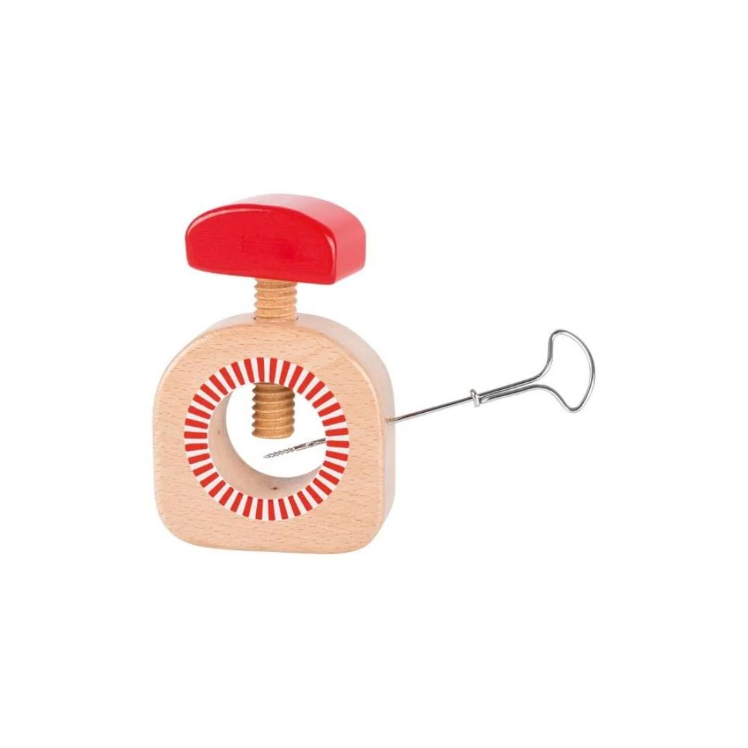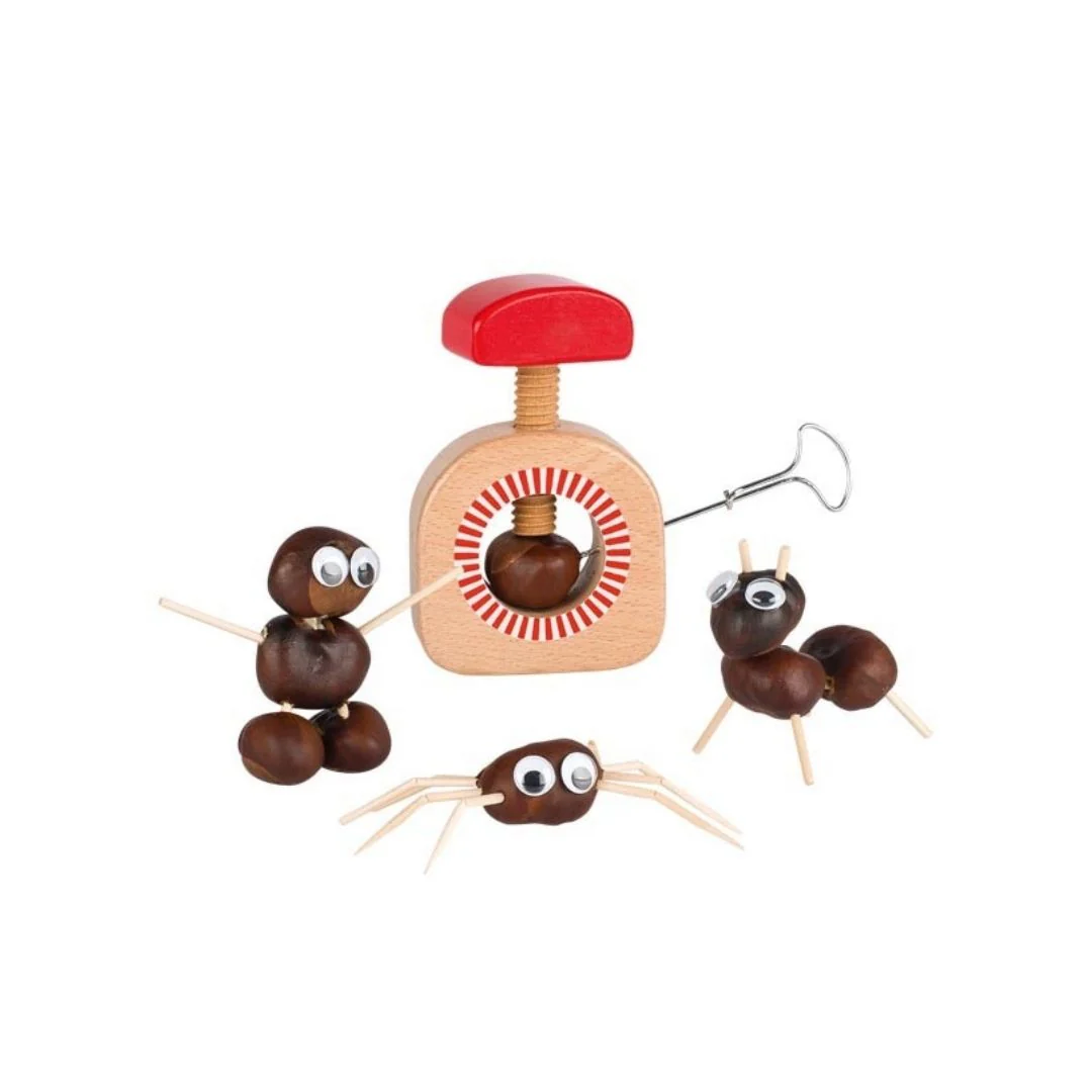 Une perceuse à marrons & casse-noix en bois de la marque Goki, un outil idéal pour passer des après-midis en famille !