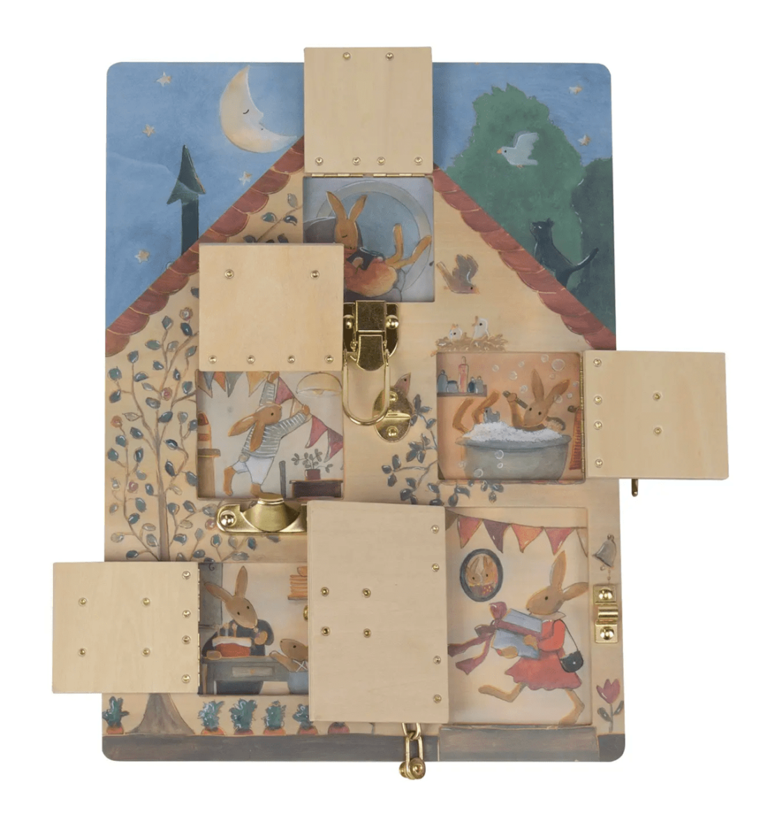 Cette planche d’apprentissage en bois type Montessori de la marque Egmont toys, est équipée de différents types de serrures et verrous ! Elle offre permet aux touts-petits de développer leur motricité fine sous forme de jeux ! Ils pourront ainsi s’entrainer à ouvrir et fermer des serrures ou verrous pour y découvrir les scènes du quotidien de la famille LAPIN !